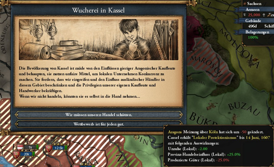 Mitte des Jahres 1597 versuchen ausländische Kaufleute lokale Unternehmen mit unfairen Mitteln zu schädigen. Dies können wir selbstverständlich nicht gestatten. "Schützt den Handel um jeden Preis! Auch wenn ihr dafür diese aragonesischen Hunde aus dem Land werfen müsst!", befahl der Erzbischof ungehalten.