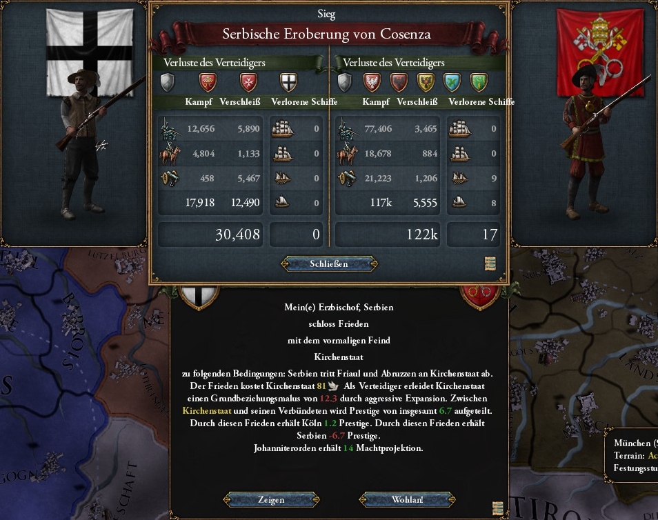 1596 griffen die Serben den Kirchenstaat an mit einem gefälschten Anspruch auf Cosenza. Also treue Verbündete des Papstes traten wir selbstverständlich in den Krieg ein. Unterstützt durch die Hilfe der Russen verbuchten die Serben zunächst auch schnelle Landgewinne. Doch konnten die päpstlichen Truppen gemeinsam mit den Kölner Truppen mehrmals russische Armeen besiegen und ihnen Entscheidende Verluste beibringen, so dass sich das Blatt des Krieges wendete, bis schließlich im am 6. Januar 1599 die Serben unter folgenden Bedingungen kapitulierten.