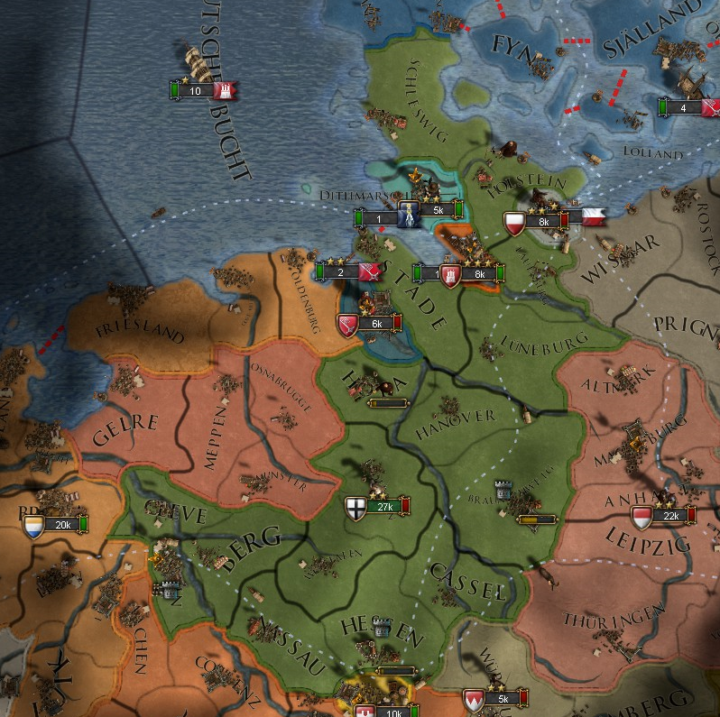 Im Jahre 1601 greift uns das ehemalige Bistum Magdeburg gemeinsam mit seinem Verbündeten aus Trier, sowie den Reichsstädten Bremen, Hamburg und Lübeck erneut an. Dies ist der zweite Konflikt mit Magdeburg nach den Religionskriegen. Sowohl der Kirchenstaat als auch Schweden ehrten ihr Bündnis mit uns und stiegen ebenfalls in den Krieg ein. Es folgten fünf Jahre voller Verwüstungen, welche auf beiden Seiten einen hohen Blutzoll forderten. Über 300.000 Soldaten sollten am Ende des Konflikts nicht mehr nach Hause zurückkehren. Mehrere große Schlachten wurden geschlagen, welche stets auf Messerschneide standen, aber dann dank Gottes Hilfe von der katholischen Seite gewonnen werden konnte. Schließlich kapitulierten Magdeburg und seine Verbündeten und akzeptierten die Friedensbedingungen, welche beinhalteten, dass die Ansprüche Kölns zur Einigung der Niedersächsischen Kultur Rechtens und unumstößlich waren.