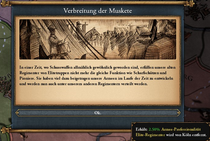 Nur einen Monat später gibt die Generalität bekannt, dass Musketen Einzug in die Truppe gefunden haben, wodurch sie die Armee-Professionalität erhöht.