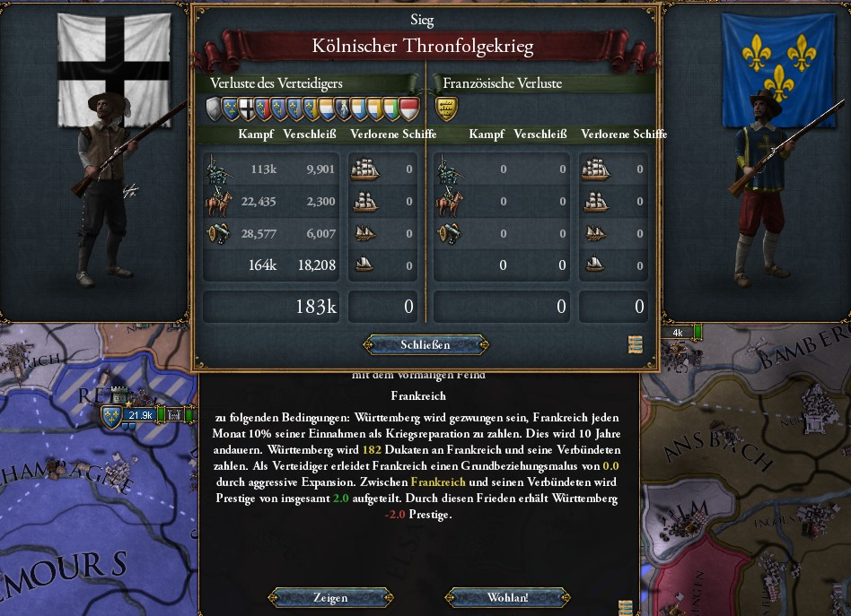 Im Jahr 1610 droht uns der Kaiser des heiligen römischen Reiches mit Krieg, wenn wir nicht den Protestantischen Glauben annehmen. Dem adeligen Erzbischof Konrad II von Waldenstein gelingt es mit dem Kaiser eine Übereinkunft zu erzielen, da er keine Möglichkeit sieht den Kaiser zu besiegen und seine Verbündeten nicht erneut in einen blutigen Krieg mitreißen will. Das Erzbistum Köln zerfällt und wird eine Administrative Monarchie unter Kurfürst Konrad II von Waldenstein, welcher zugleich zum protestantischem Glauben konvertiert. Somit verliert Köln den Titel des Legatus Natus.