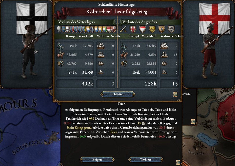 23 Jahre sind vergangen seit dem letzten Eintrag in der Kölner Chronik. Leider können diese 23 Jahre auch nicht mehr ergänzt werden, da bei der Erweiterung der Kölner Kanalisation das Stadtarchiv eingestürzt ist und alle Dokumente zu dieser Zeit verloren gegangen sind (Ich habe EU4 von meinem alten PC gelöscht ohne die Screenshots zu sichern