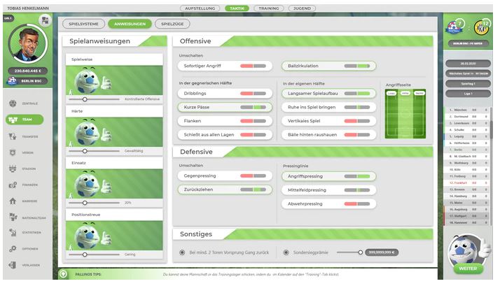 Im Spieltagskader wird die Aufstellung für das nächste Spiel bestimmt. Als Basis können moderne Spielstile und Formationen übernommen oder komplett eigene Spielsysteme erstellt werden.