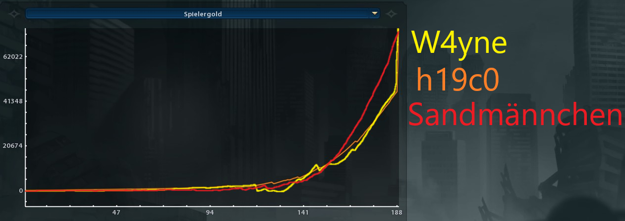 In dem Bild sieht man exemplarisch die Spielerwissenschaft des Siegers W4yne. Bis ca. Runde 150 war sein Fokus voll auf Wissenschaft mit Campusstätten Projekten, damit er den Big Ben erbauen kann. Erst nach Erreichen dieser Hürde hat er seinen Fokus voll Gulden Produktion gestellt (Siehe weiter unten das Bild zum Spielergold). Bei h19c0 und rage sehen die Graphen sehr ähnlich aus. Lediglich bei Sandmännchen beginnt der Abbruch von Wissenschaft und den Beginn von extremem Gulden produzieren ca. 15 Runden früher. Im Gespräch mit ihm kam heraus, dass er zu diesem Zeitpunkt schon wusste, dass er den Big Ben nicht mehr fertigstellen kann.