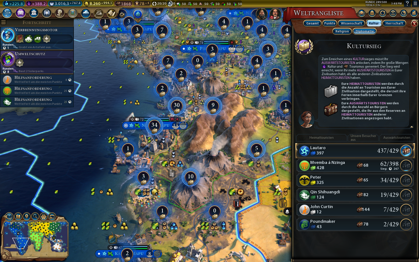 Zum Glück hatte in Amerika niemand eine Religion gefunden und so war es relativ einfach Amerika für Popcorn (Popcorn, weil wir im Lategame auf Rockbandy zur Religionsverbreitung setzen wollten. - Deshalb auch Glaube durch Weltwunder und Bevölkerung als Religionseigenschaften.) zu gewinnen. Man sieht hier schön die Barikade bei Uruk, die viele Kampfpanzerarmeen und andere Tote herbeigeführt hat. Hier sieht man die ganzen Theaterbezirke etc.