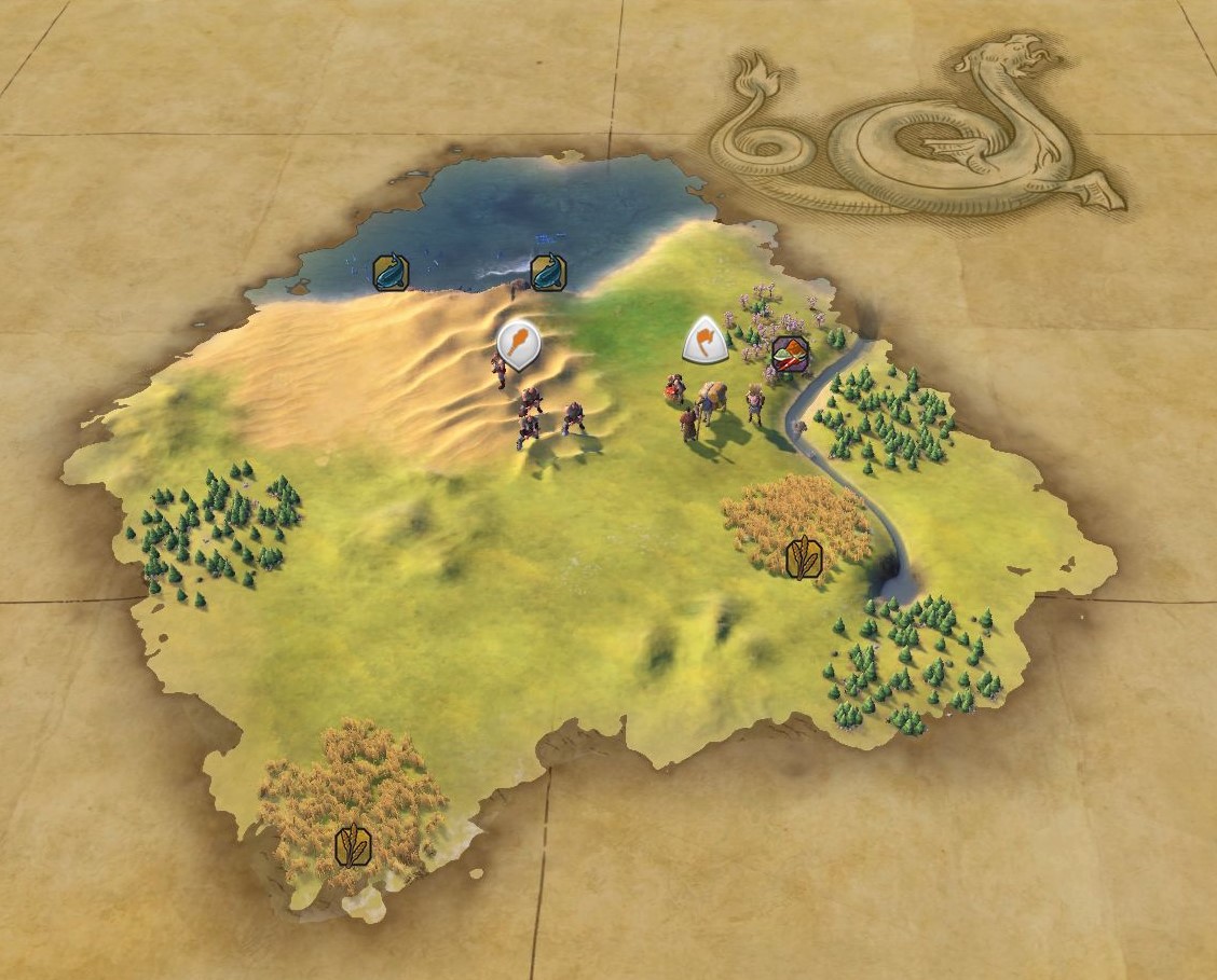 - Es gibt auf der Karte 10 Landmassen. Zwei große, auf denen die Zivilisationen starten, und 8 kleine "Bonusinseln" für gesicherte ZAP und konkrete Ziele. Jede dieser Bonusinseln birgt die Möglichkeit, zusätzliche ZAP zu verdienen. Manche durch bloßes Erkunden, viele aber auch durch das Gründen einer Stadt auf ihnen.