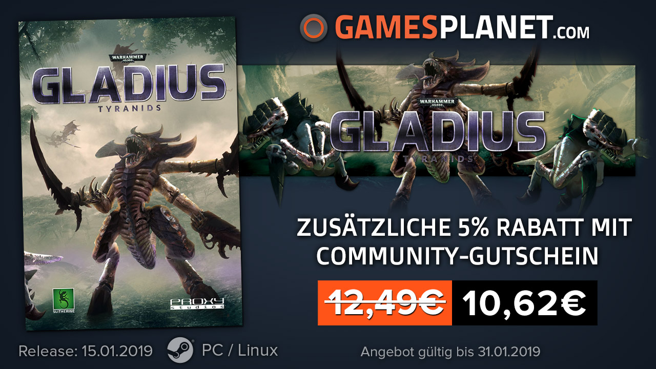 Heute erscheint mit Tyranids das erste AddOn zu Warhammer 40k Gladius. Mit dem Gutschein-Code TYRANNUSBULLUSREX bekommt ihr es bei Gamesplanet mit Extra-Rabatt über diesen Shoplink.