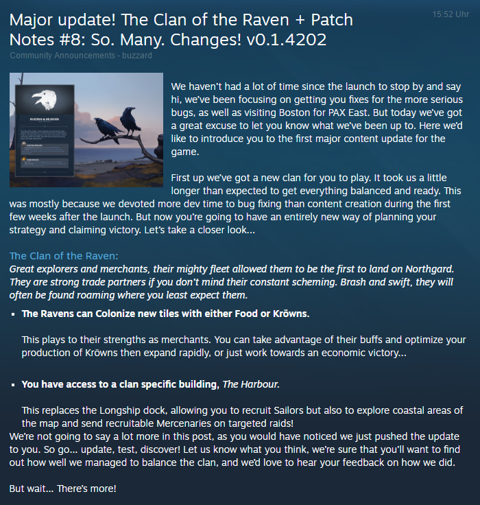 Das erste große Update für Northgard bringt dem Early-Access-Strategiespiel unter anderem einen neuen spielbaren Stamm, den Klan des Raben. Ehrensache, dass wir uns sofort schwarze Federn anlegen und in die Lüfte schwingen!