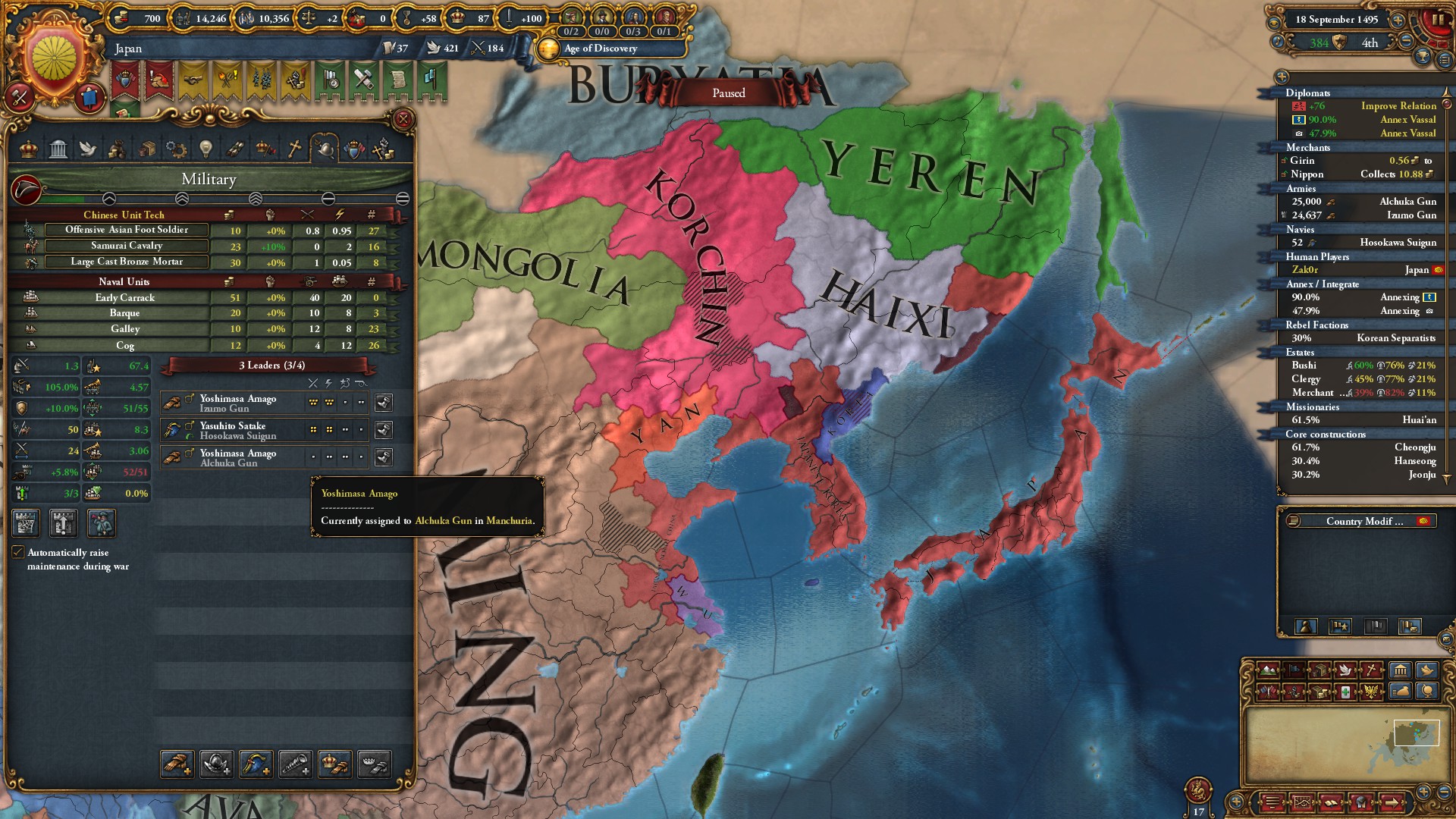 In einer Einzelspielerpartie, in der ich Japan gegründet hatte, bekamen zuerst zwei über einen Zeitraum von mehreren Jahrzehnten, aber nacheinander rekrutierte Generale exakt den gleichen Namen vom Namensgenerator. Das fiel mir dann erst auf, als ich zu Belagerungszwecken den besseren umverlegen wollte und an meinen Lesefähigkeiten zu zweifeln begann, als doch der schlechtere in der Armee gelandet war. Und als einer dann lange Zeit später starb und ersetzt wurde, hieß der neue auch wieder genauso. Oder heißt Yoshimasa Amago auf Japanisch einfach "General"?