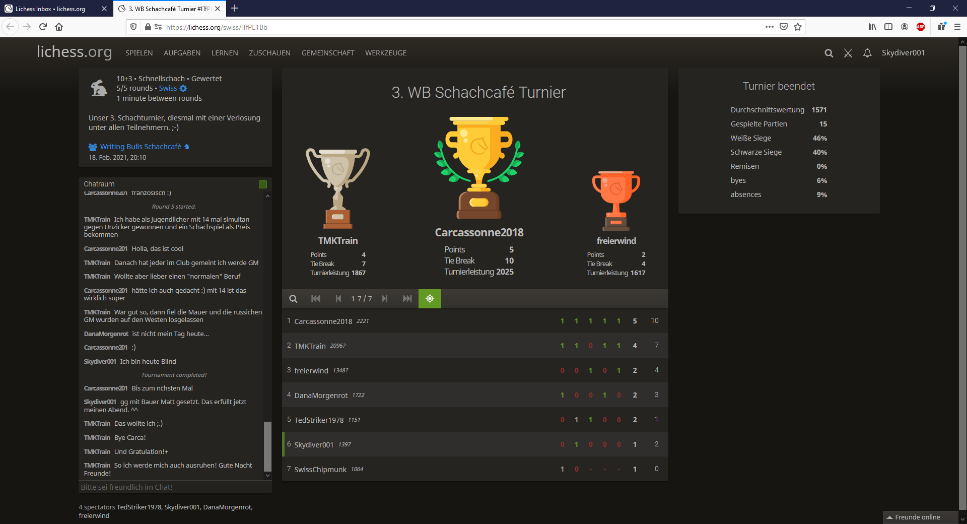Herzlichen Glückwunsch an Chipmunk und Freierwind für den jeweiligen Turniersieg und vielen Dank an euch alle für die schönen Partien und das nette beisammensein.