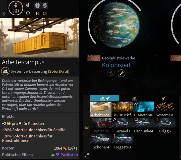 Den Arbeitercampus kann ich immer wieder bauen. Wenn ich ihn gebaut habe, taucht er direkt wieder in der Bauliste auf. Bug oder Feature? In der Beschreibung deutet eigentlich nichts auf ein wiederholbares Projekt hin. Was bedeuten die beiden Symbole bei der Heldeneigenschaft "Herr über die Menge"? -20% wofür? Sollte ich das System Quyos nicht kulturell übernehmen? Oder geht das nicht, weil zwischen mir und den Sophons Frieden herrscht? Fehlt mir evtl. eine Tech oder ist kulturelle Übernahme im Spiel gar nicht vorgesehen? Dann habe ich die "Warnung" bekommen, dass ich kurz vor einem Wirtschaftssieg stünde. Dabei bin ich meiner Meinung nach noch weit entfernt. Wer täuscht sich hier? ;)