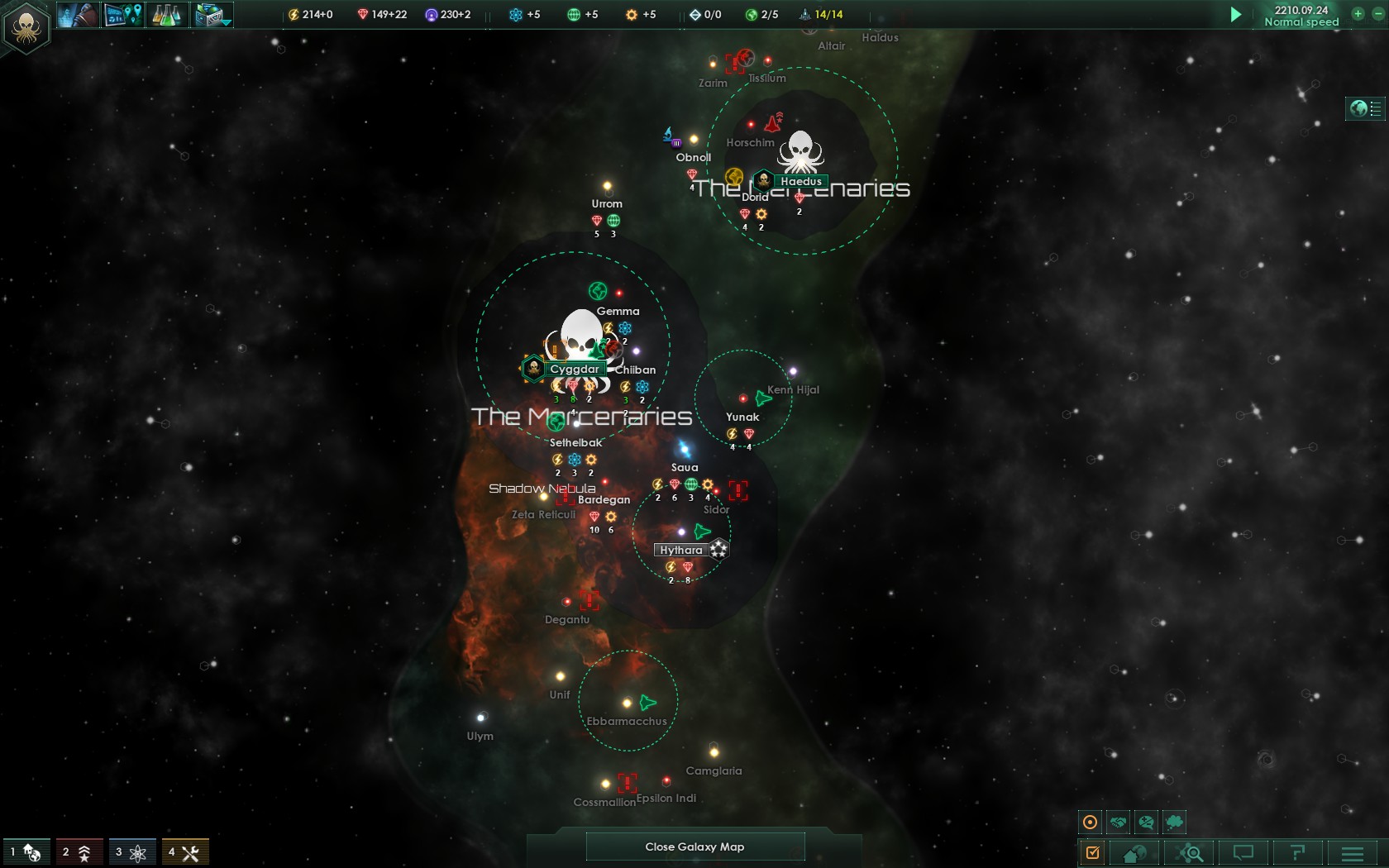 RB: „Der Ausbau der ersten Kolonien war nötig. Wir sollten jetzt ein gutes Plus erwirtschaften. Zusätzlich konnten wir mehrere Drohnen in den umliegenden Systemen entdecken. Wir sind uns sicher, dass sie in reichen Systemen sind.“