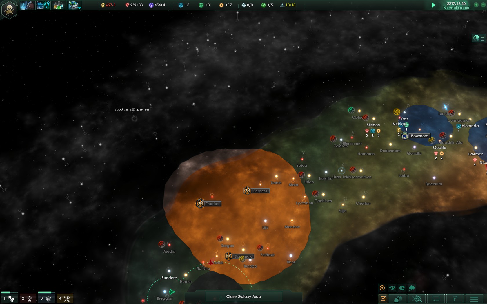 Planeten gibt es zwar einige wenige in meiner Nähe (gespielt wird übrigens mit 150% bewohnbare Planeten) und ich werde nach Möglichkeit nur so viele Planeten besiedeln, wie ich es ohne Sektor aushalte. Sektoren mag ich in meiner Rolle und als Spieler nämlich nicht besonders und da ich das Flottenlimit nicht ganz so ernst nehme und übersteigen werde, muss ich so schon Abstriche in der Wirtschaft machen.