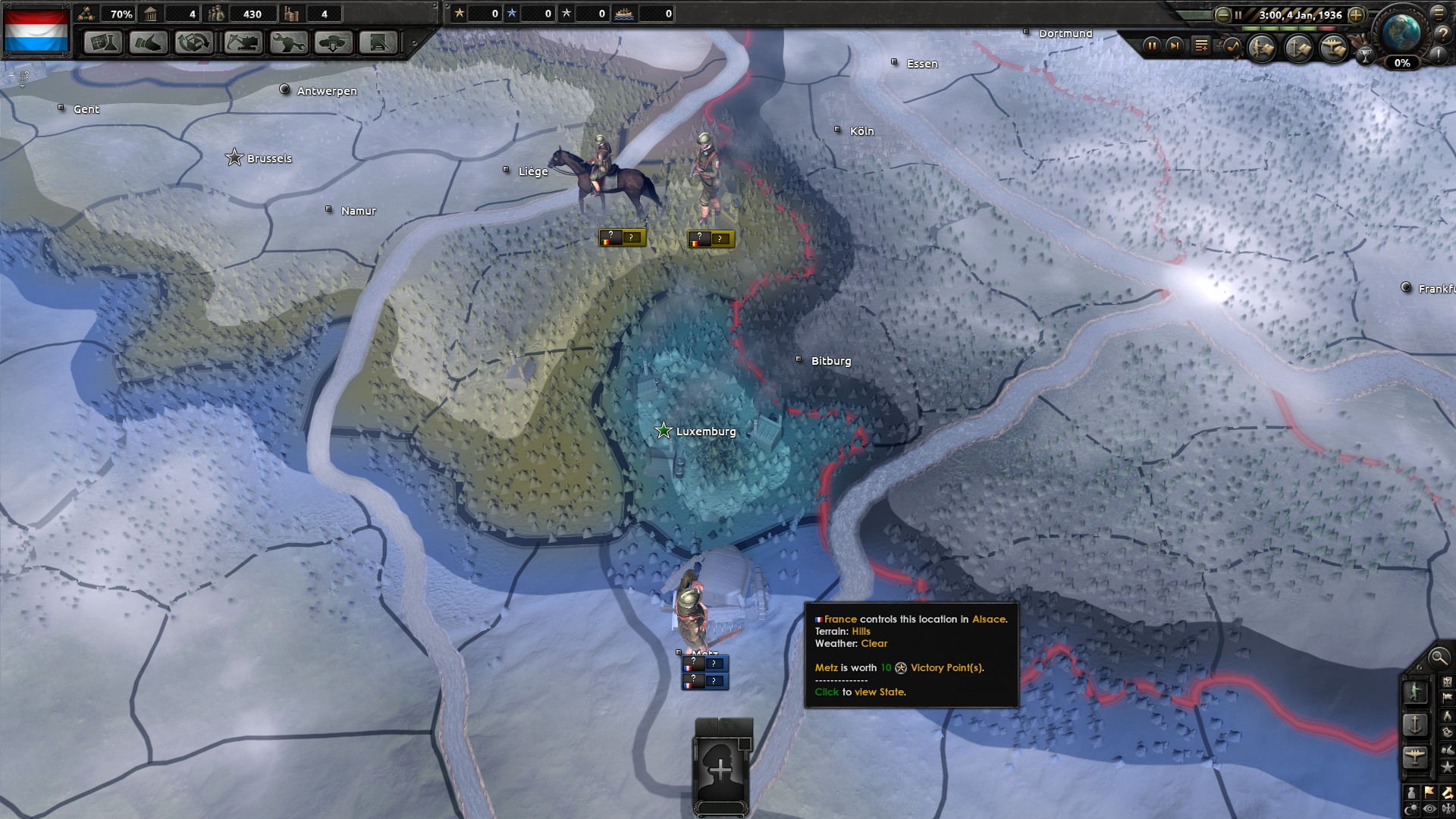 Ab einem gewissen Zeitpunkt greift die Deutschland KI deswegen auch nicht mehr an (nur komische spanische Freiwillige). Die KI denkt zu dem Zeipunkt einfach, das der Aufwand scheinbar zu groß ist und Luxemburg lieber belagert. Aus dem Grund war es für mich kein Problem bis 1945 durchzuhalten. Entscheiden sind die Monate Oktober und November, ab Dezember sollte es leichter werden und spätesens mitte 1940 muss man keine Angst mehr haben.
