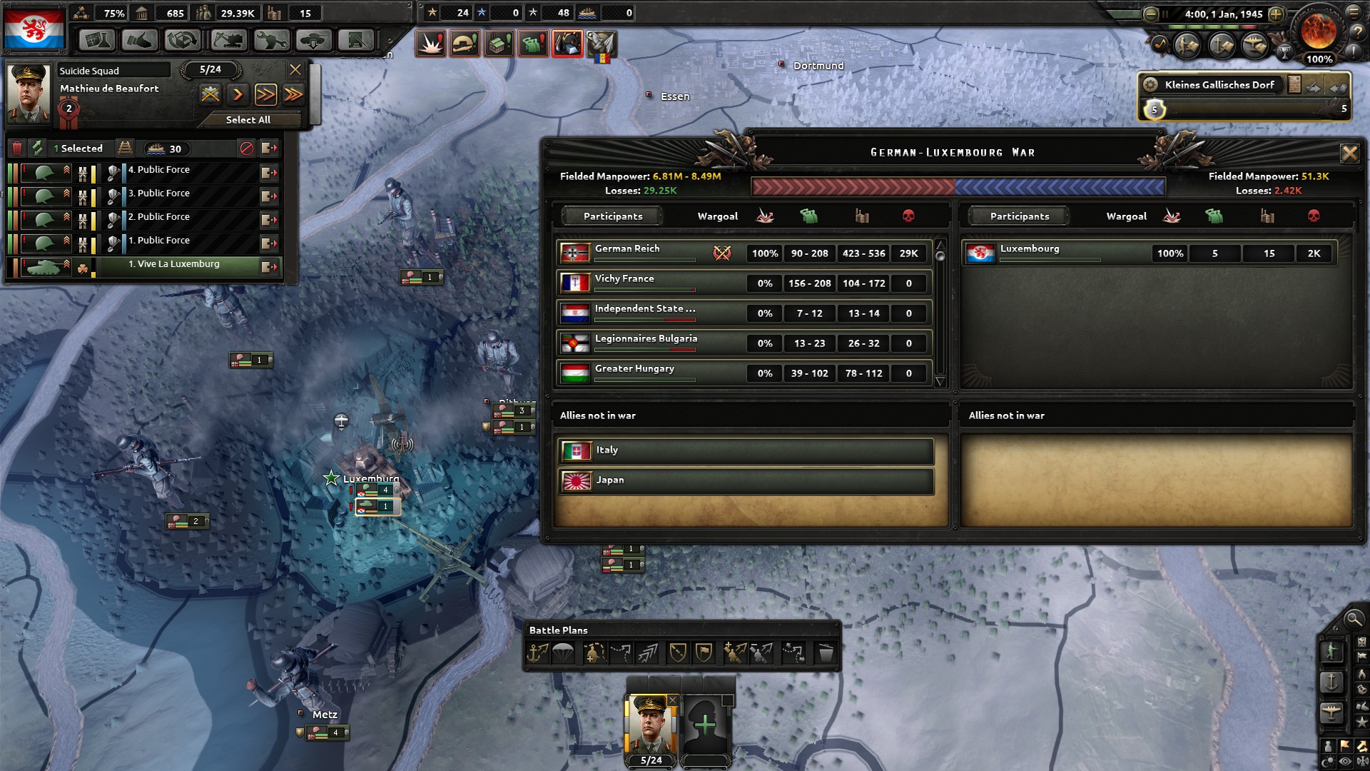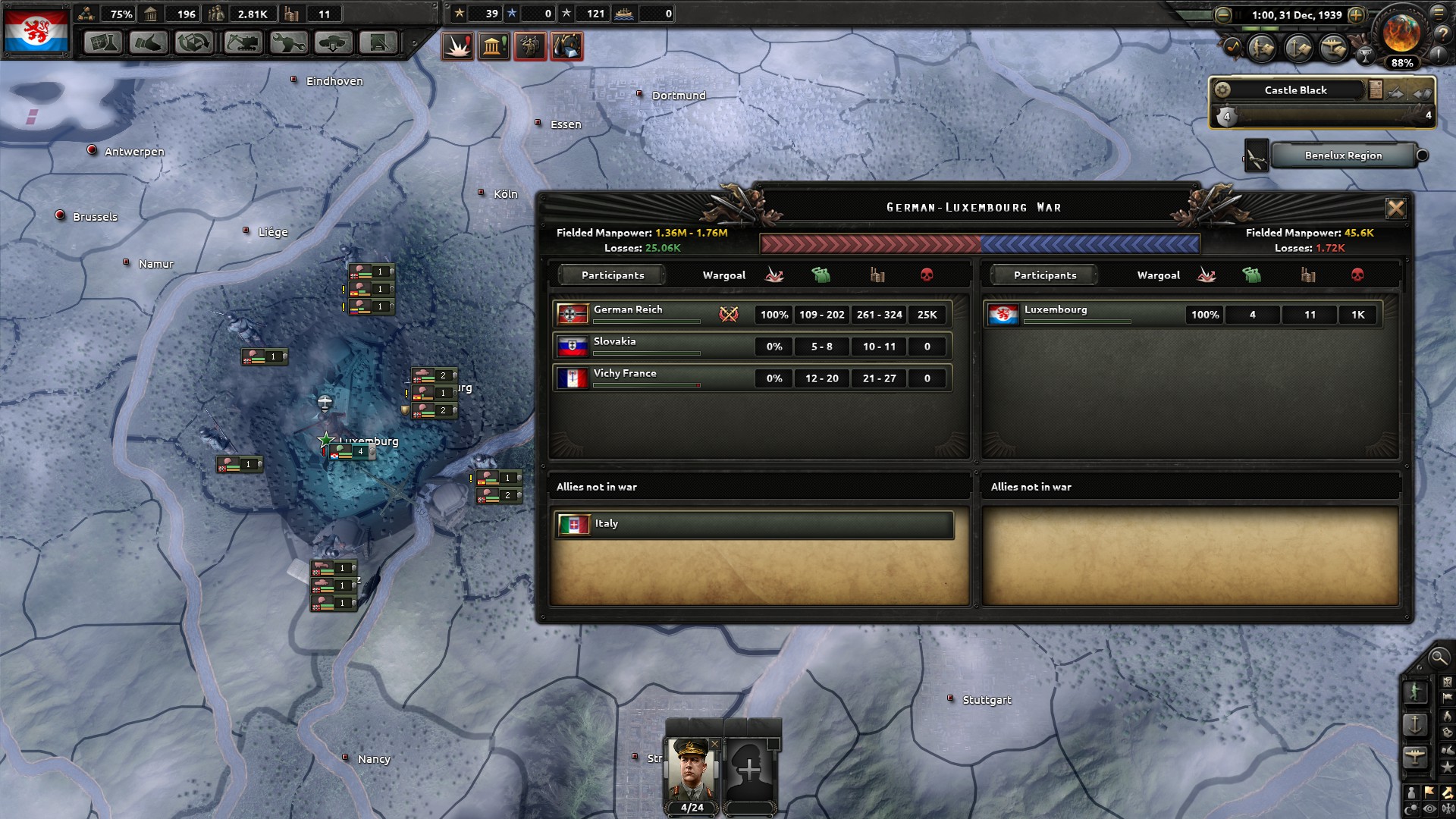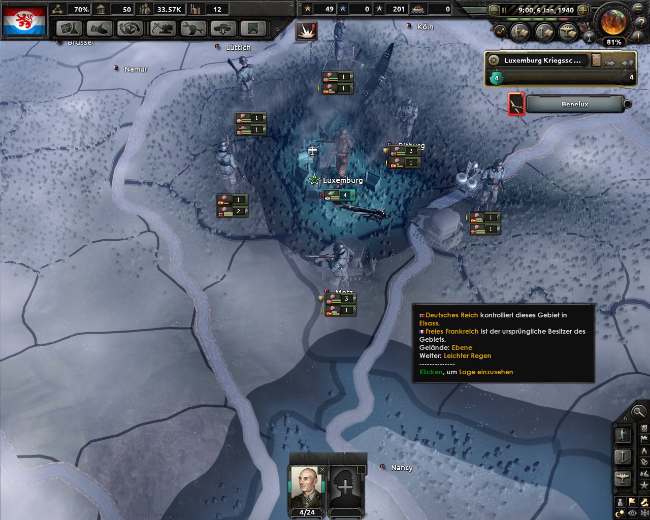 Der Kriegsverlauf ist am Anfang gar nicht schlimm, da man eigentlich nur ein Front hat. Wirklich brenzlig wirds sobald Belgien und die Niederlande gefallen sind und später auch Frankreich. Grund hierführ ist, das man einerseits im Kampf den Umzelingsmalus erhält aber auch weil die Deutschen ihre Taktischen und Strategischen Bomber dazu benutzen die Bunker runterzuhauen. Egal wie gut die Divisionen sind die man hat, die Bunker sind das was Luxemburg am Leben hält. Aus dem Grund ist es wichtig, das man die Bomber so gut es geht abfängt.