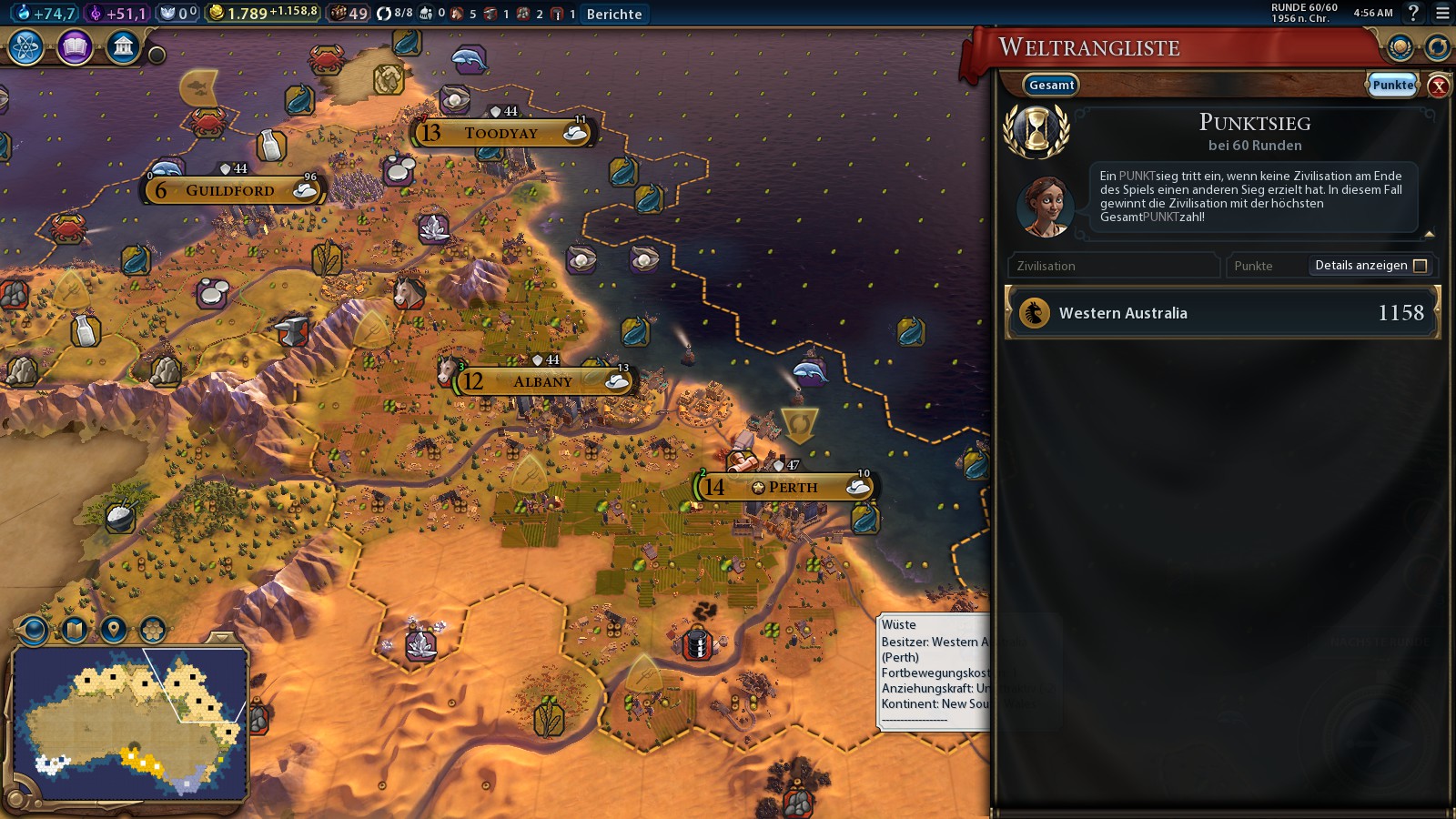 weiter so WB und Enttäusche uns NICHT..Pflege Freundschaft mit den Ureinwohnern und Scheffel Gold ohne Ende..mal was anderes dieser Pack mit Australien..ich selbst habe glaub ich noch nie ein Szenario gecivvt..hi hi..mal sehen ob es mich irgendwann einmal "übermannt es zu spielen..aber mich interessiert schon ob WB auf König es schaffen wird..ich sage ja ,Vorsicht vor den Giftigsten Tiere der Welt,die es in Australien ja gibt..