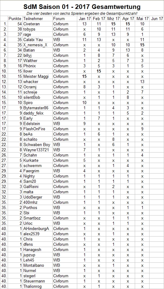 In der Gesamtwertung bleibt Civeteran vorne, der diesmal ein Streichergebnis lieferte. ;)