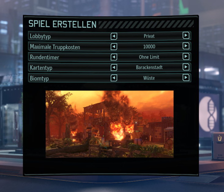 Ein Commander öffnet im Mehrspielerbereich den Punkt „Benutzerdefiniertes Spiel erstellen“ und gibt die unten aufgeführten Vorgaben ein: