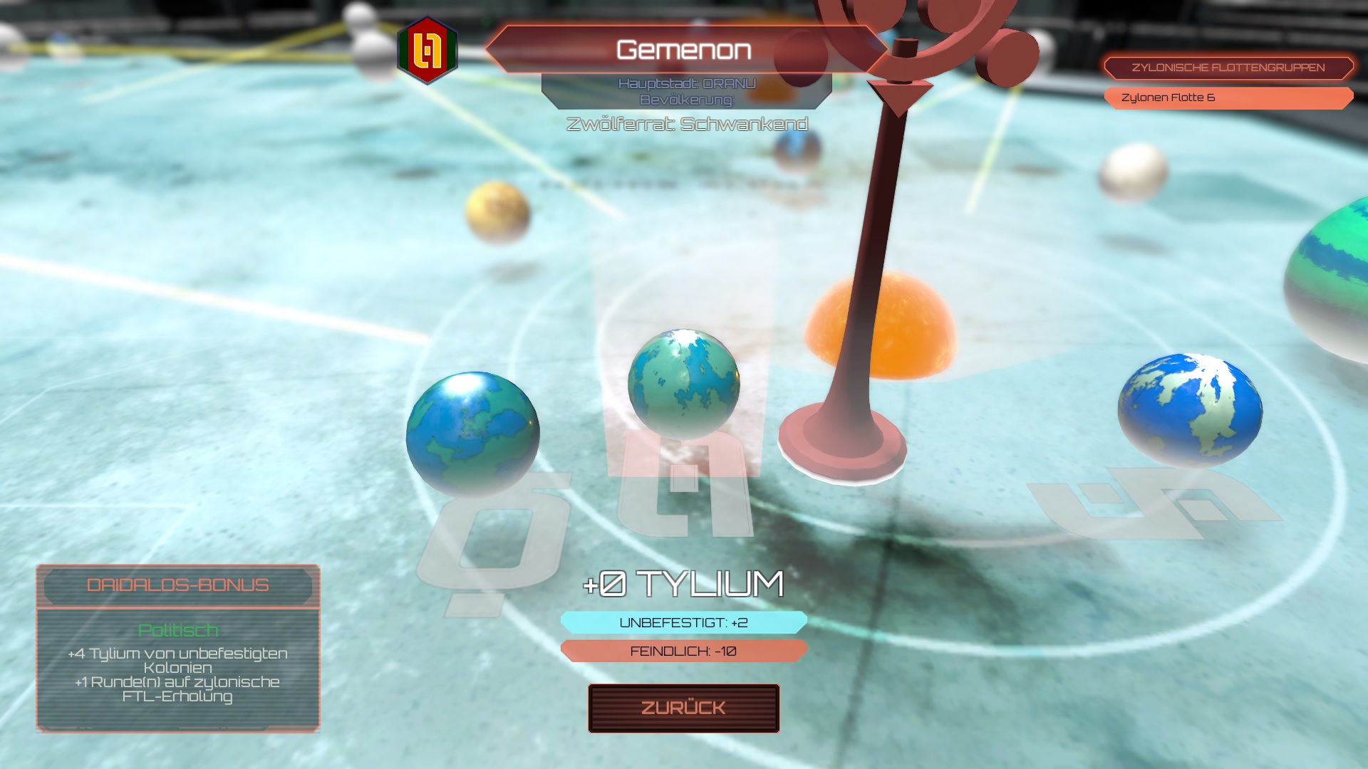 Die Zylonen wurden ein fester gesellschaftlicher und militärischer Bestandteil der 12 Kolonien von Kobol. Dabei wurde übersehen, dass die Fähigkeit zu bewussten Entscheidungen zu einer Entwicklung führte, welche die Zylonen dazu brachte, gegen ihre Schöpfer zu rebellieren und ihren Höhepunkt im Ersten Zylonenkrieg fand. In der dynamischen Kampagne von Battelstar Galactica Deadlock kämpft der Spieler nicht nur in den Storymissionen gegen die kybernetischen Rebellen. Die Zylonen gehen auch zum Gegenangriff über und blockieren mit ihren Flotten die Kolonien. Werde die Kolonien von den Zylonen belagert, können diese keine Ressourcen mehr an die koloniale Flotte liefern und müssen erst wieder befreit werden. In den Kolonien stationierte Offiziere helfen den Befestigungswert einer Kolonie zu erhöhen. Wartet der Spieler mit der Befreiung zu lange, kann die Kolonie den Zwölferrat verlassen und tritt damit aus dem Bündnis aus.