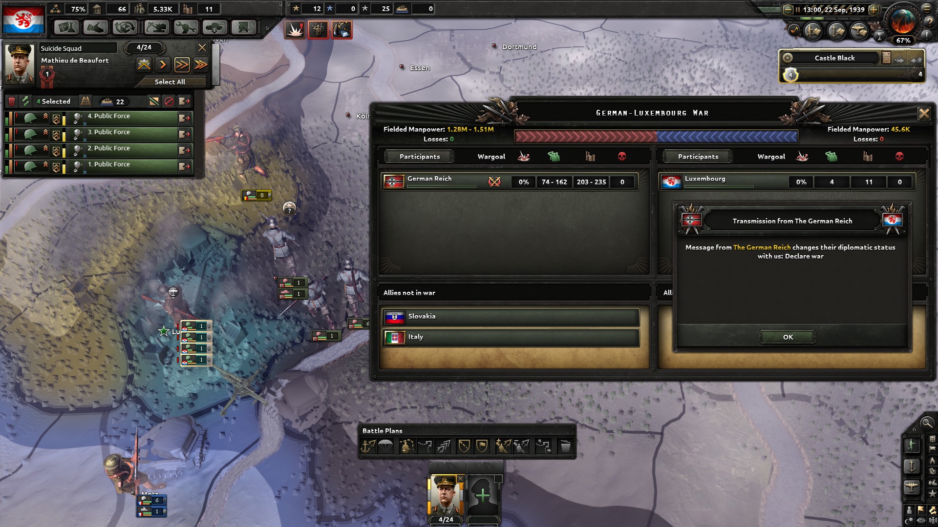 Der Kriegsverlauf ist am Anfang gar nicht schlimm, da man eigentlich nur ein Front hat. Wirklich brenzlig wirds sobald Belgien und die Niederlande gefallen sind und später auch Frankreich. Grund hierführ ist, das man einerseits im Kampf den Umzelingsmalus erhält aber auch weil die Deutschen ihre Taktischen und Strategischen Bomber dazu benutzen die Bunker runterzuhauen. Egal wie gut die Divisionen sind die man hat, die Bunker sind das was Luxemburg am Leben hält. Aus dem Grund ist es wichtig, das man die Bomber so gut es geht abfängt.