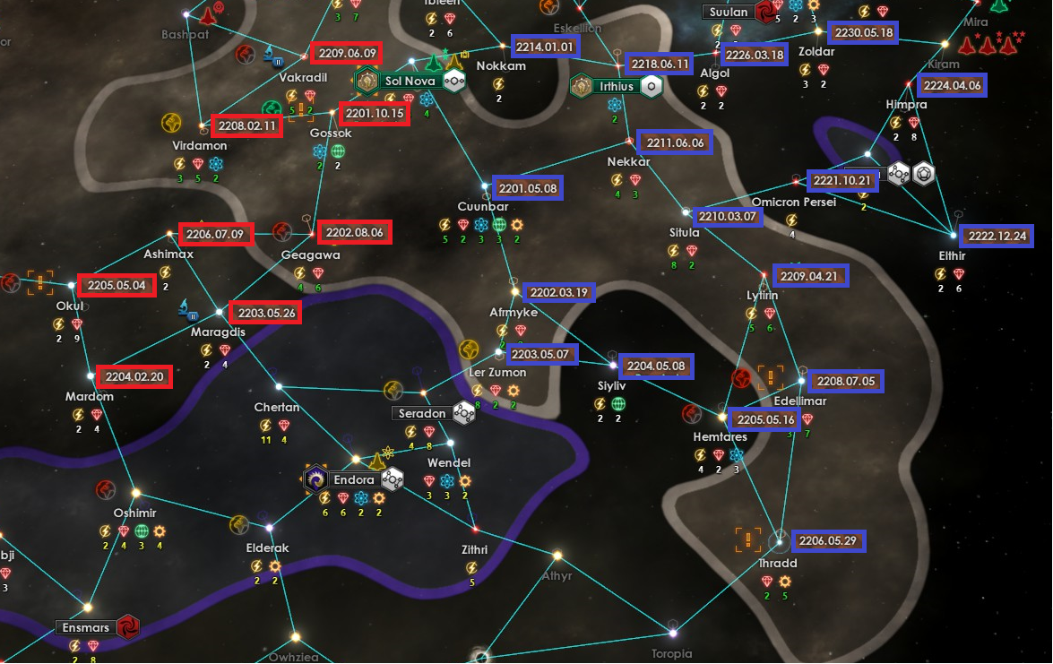 Nur einen Augenblick später wendet Aurora ihren Blick zur Wand. „Gaia! Zeige mir alle die von uns erkundeten Systeme. Reichere die Sternenkarte mit einem Zeitindex an, wann die jeweiligen Systeme erkundet worden sind.“ Nur ein Bruchteil einer Sekunde später erscheint auf der eins weißen Wand eine Sternenkarte. „Markiere nun alle Systeme blau, die das Forschungsschiff Pomponius Mela erkundet hat. Und markiere die restlichen Systeme, die von der Dionysius erkundet worden sind, rot.