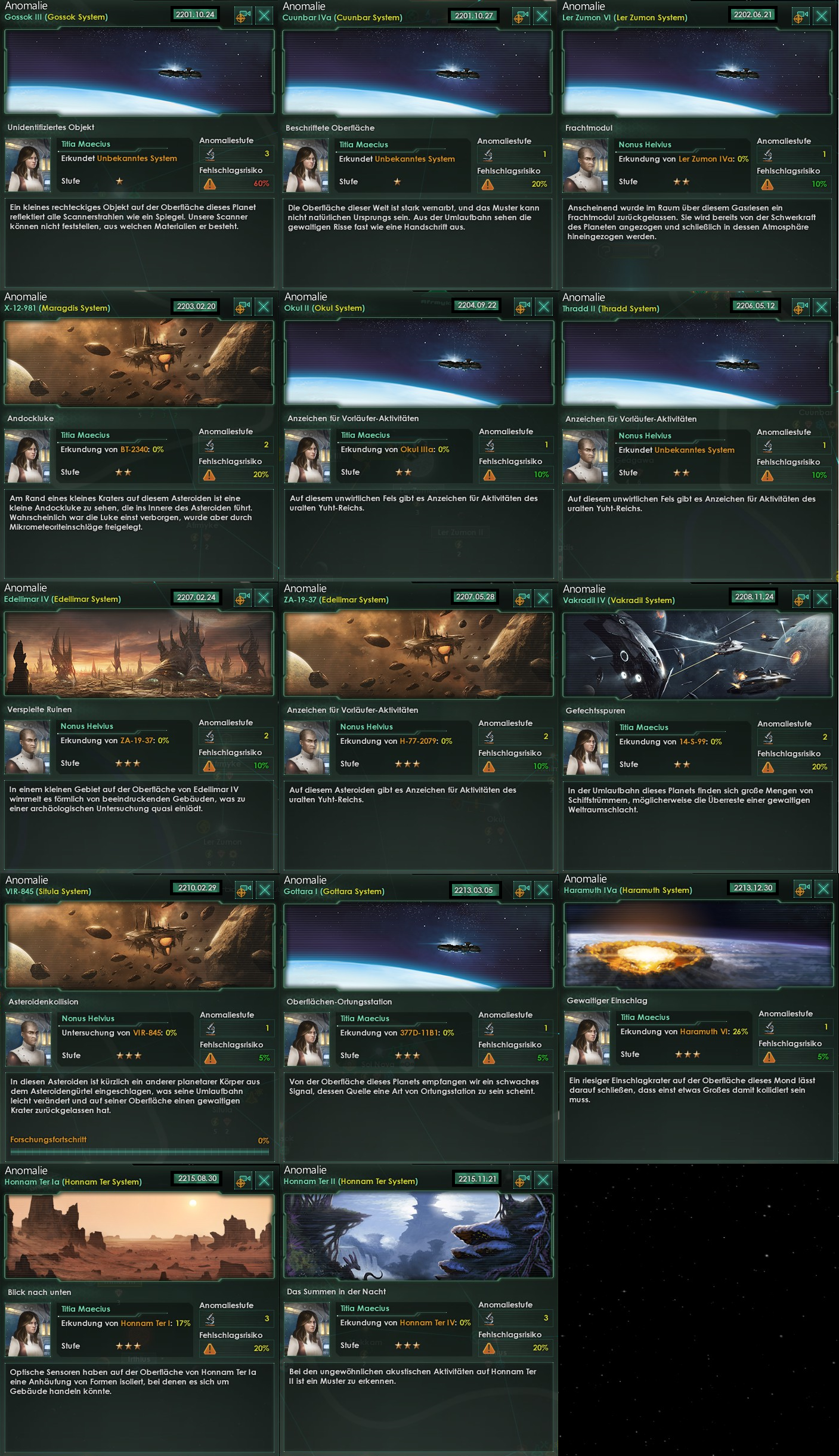 Nun gut Gaia, lass uns jetzt der Gouverneurin Matrinius und der Admirälin Gabinius zuwenden. Was kannst du mir über ihre Arbeit berichten?“, wollte die Erzpriesterin wissen. Unverzüglich änderte sich der Bildschirm. „Unter der Führung der Gouverneurin ist es uns gelungen Terra Nova wie geplant auszubauen.“, erwiderte Gaia. „Weiterhin konnten wir auf der erdenähnlichen Welt Elysium erfolgreich eine Kolonie errichten. Zum Glück konnten wir rechtzeitig die planetaren Scanner aktivieren um ein schlimmes Unglück zu verhindern. Noch rechtzeitig wurde ein Asteroid, der auf den Planeten zuflog, entdeckt und von unserer Flotte erfolgreich vernichtet. Weiterhin findet gerade die Kolonisation von Colonia Pacifica statt, einer ebenfalls erdenähnlichen Welt, die sogar von einem für Terraner bewohnbaren Mond umkreist wird.“ Und langsam wurde das grimmige Gesicht durch ein zufriedenes ersetzt. „Admirälin Gabinius hat ebenfalls alle Herausforderung gemeistert. Ob es die Night Terrors Piraten waren, die Weltraumwolke oder der Asteroid, der Elysium bedrohte. Alle Bedrohungen wurden mit minimalen Verlusten ausgeschaltet.“ „Ich bin beistert Gaia. Sichere die erstellten Daten und sende sie ans Archiv und an die Suprema. Dann ist die Arbeit hier erledigt.“, stellt die Erzpriesterin fest und gießt sich noch eine Tasse Tee ein. „Leider noch nicht“, widerspricht der Assistent ihr. „Ich muss darauf hinweisen, dass die Archivare auch Daten über unsere Erstkontakte haben wollen, sowie den uns bekannten Aliens.“ Aurora errötete. Wie konnte sie das Wichtigste nur vergessen. „Du hast natürlich recht“, sprach sie verlegen. „Dann erstelle eine tabellarische Übersicht unserer Erstkontakte mit dem dazu gehörigem Zeitindex. Füge anschließend eine Übersicht der uns bekannten Spezies an mit einer Übersicht ihrer Eigenschaften und wenn möglich ihrer ethischen Gesinnung.“ Und erneut änderten sich die Informationen an der Wand.