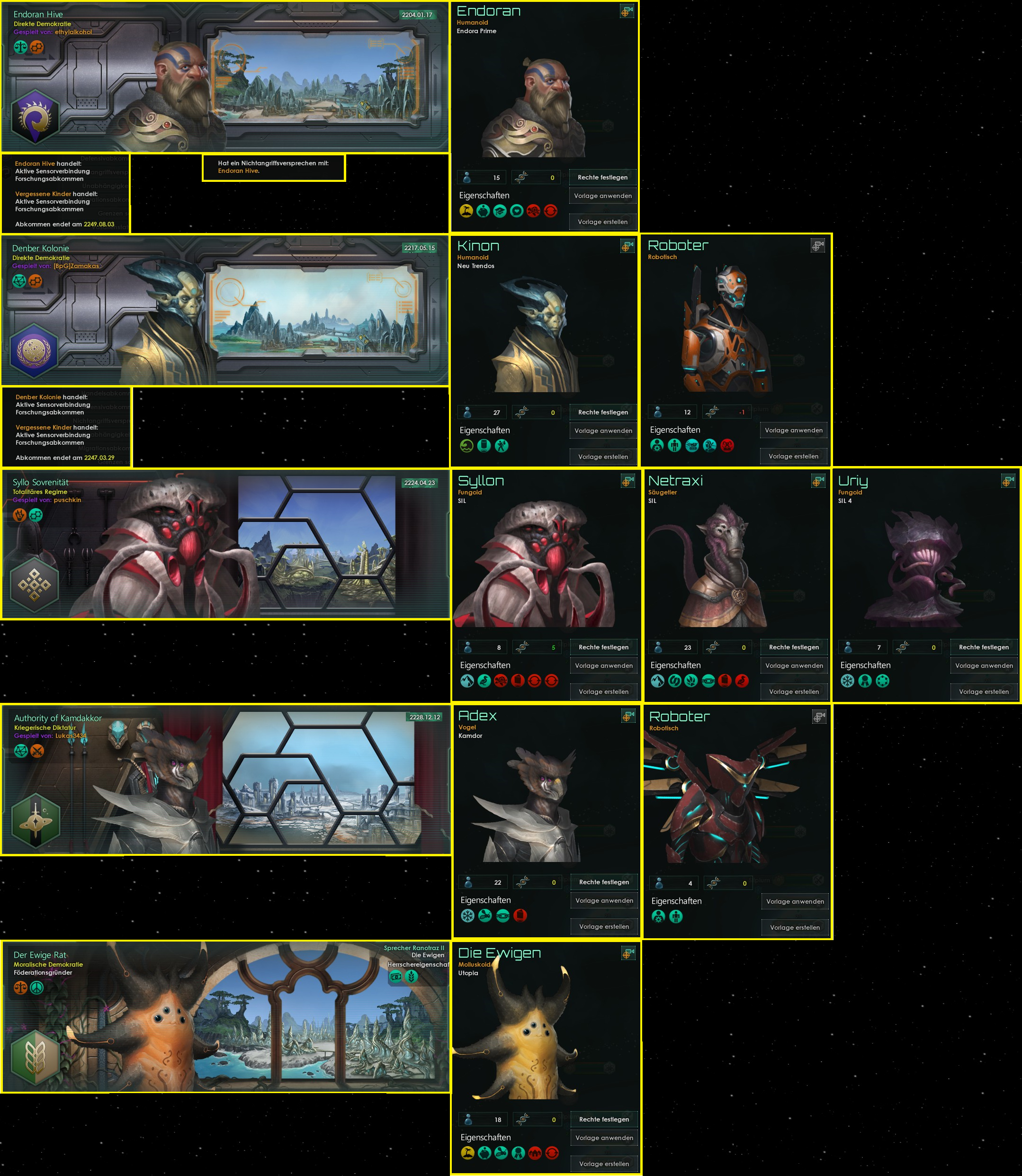 Mit schwerer Stimme fährt Aurora fort. Sie diskutiert energisch, spricht jedoch langsam, Satz für Satz. "Lasst uns nun über die diplomatische Arbeit unserer Unterhändler sprechen. Ich schlage vor, dass wir uns zuerst mit den Erstkontakten beschäftigen und anschließend über die neuen Entwicklungen mit bereits bekannten Kontakten sprechen. Danach hätte ich gerne noch eine abschließende Meinung zu Enklaven." "Sehr wohl!", erwidert Gouverneurin Vopisca Matrinius, welche nicht nur für den ganzen terranischen Kernsektore verantwortlich ist, sondern auch die Ressortleiterin des diplomatischen Corps ist. "Als erstes möchte ich über die Authority of Kamdakkor sprechen. Dies ist eine kriegerische Diktatur, bei welcher sich der Status eines Individuums scheinbar durch die Jagd nach Beute und Trophäen definiert. Unser Stab vermutet, dass eine erfolgreiche diplomatische Interaktion mit dieser Spezies nur auf Basis von Stärke und Autorität erfolgen kann. Eine Delegation oder Vereinbarungen gibt es mit der Authority aktuell nicht. Der nächste Kontakt fand mit dem Zin Imperium, einem Banditenkönigreich, statt. Auch dies ist eine kriegerische Spezies, welche nur wenige Dinge für heilig hält. Kämpfen heißt für sie zu leben und die Stärksten können in ihrer Gesellschaft alles ergreifen was sie begehren. Wie ein Verbrechersyndikat organisiert, sieht das Zin Imperium Nachbarstaaten nicht mehr als Angriffsziele um Beute zu machen. So ist die Handelsrepublik Ramal, auf die ich zu einem späteren Zeitpunkt zu sprechen komme, bereits Opfer dieses organisierten Überfalls geworden. Aufgrund der aggressiven Verhandlungsweise der Zin, blieb unserem Botschafter Caecillius Gemellus nichts anderes übrig als das Erstkontaktgespräch abzubrechen und die Zin auf die terranischen Regularien zum ersten Kontakt hinzuweisen. Nach zwei schwierigen Erstkontakten folge der Kontakt mit dem Reich der Mi'au. Clara Uranius war unsere Botschafterin, die den Erstkontakt mit den Mi'Au etabliert hat. In ihrem Bericht bestätigt sie, die Liebe des Katzenvolkes zu Glitzersteinen. Zum Glück haben wir die Vorliebe der Mi'Au dafür von den Endoran erfahren und konnten dies für einen diplomatischen Vorteil unsererseits nutzen. Der Erstkontakt an sich verlief sehr friedfertig. Die Botschafterin weist in ihrem Bericht jedoch explizit daraufhin, die Art der Mi'Au dümmlich und tollpatschig zu wirken, nicht zu unterschätzen. Im Gegenteil, sie schätzt die Mi'Au als hochintelligent ein und ihr Treiben eher als eine gute Fassade. Als viertes möchte ich die Handelsrepublik von Ramal vorstellen. Die Handelsrepublik sind Kapitalisten durch und durch, deren streben nach Profit die Grundlage ihrer Gesellschaft bildet. Sicherlich könnten in Zukunft gute Geschäfte mit ihnen geschlossen werden, von denen beide Seiten profitieren. Doch zum aktuellen Zeitpunkt bildet unsere Wirtschaft große Überschüsse in allen Bereichen, so dass unsere Lager voll sind und die Händlerkaste aufgrund dessen keinen Bedarf für Handelsverträge sieht, vor allem weil die Handelsrepublik uns nichts bieten kann, was wir nicht im Überschuss haben. Weiterhin sollte man die militärische Macht dieser kleinen Nation nicht unterschätzen, ist es ihnen doch gelungen im Krieg gegen die Krieger des Zin Imperiums den Status quo zu erreichen und einen weißen Frieden mit ihren Widersachern zu schließen." Nachdem die Gouverneurin den Bericht zu der Handelsrepublik von Ramal beendet hat, nimmt sie sich eine kurze Pause um ihrer ausgetrockneten Kehle Linderung zu verschaffen und nimmt einen kräftigen Schluck aus dem vor ihr stehendem Glas Wasser. Die ihr noch immer zu gewandten Blicke der anderen sind ihr unangenehm, doch lässt sie sich nicht beirren. "Wo war ich noch? Ach ja. -Der nächste Erstkontakt erfolgte mit dem Orden des Zwielichts, einer überaus interessanten Nation, von der wir sicherlich einiges lernen können. Mitglieder der Spezies der Je'daii haben gelernt ihre mentalen Fertigkeiten, welche sie einfach nur die Macht nennen, zu kontrollieren und diese zu Nutzen. Wie die Erzpriesterin sicher bestätigen kann, werden auch in unserem Volk vereinzelt Kinder mit außergewöhnlichen mentalen Fähigkeiten geboren. Unserem diplomatischem Corps ist es gelungen mit dem Orden eine Übereinkunft zu schließen, welche zum Ziel hat, dass Potenzial dieser Kinder zu ermitteln und sie zu Machtnutzern auszubilden. Dazu haben wir sowohl ein paar Auserwählte zur Heimatwelt des Ordens geschickt, als auch einen Ordenstempel auf Terra Nova gegründet, in welchem Je'daii Meister ihre Schüler unterrichten. Positiv anzumerken ist, dass der Orden des Zwielichts unsere Lebensweise positiv bewertet hat und die vergessenen Kinder auf der hellen Seite der Macht sieht. Was es mit der hellen und dunklen Seite der macht auf sich hat, muss jedoch noch geklärt werden. Uns ist das Konzept dieser zwei Wege noch nicht klar, doch das soll sich in Zukunft ändern und dazu wird das Migrationsabkommen zwischen unseren beiden Reichen sicherlich beitragen. Weitere Vereinbarungen wurden nicht geschlossen. Den vorerst letzten Erstkontakt gab es mit der Tri Sari Union, einer Nationen in der die beiden Spezies Tri und Sari in Harmonie nebeneinander leben und große Freiheiten genießen. Zwar sehen wir ihre demokratische Regierungsform sehr skeptisch, aufgrund der Erfahrung auf der Erde, doch scheinen die Tri und die Sari damit zu Recht zu kommen. Immerhin hat es ihre Nation zu den Sternen geschafft ohne sich dabei vorher selbst zu vernichten. Unsere Diplomatin Julia Aurelia konnte über einen sehr erfolgreichen Kontakt mit den Delegierten dieser Nation berichten. Sie berichtet, dass man in ihnen sicherlich gute Handelspartner oder sogar Verbündete haben könnte. Doch bis dahin ist es noch ein langer Weg. Aktuell befinden wir uns noch am Anfang der Gespräche. - Vielen Dank!", bedankte sich Vopisca bei ihren Zuhörern. "Was ist mit dem seltsamen Volk, welches sich in dem Raum zwischen d