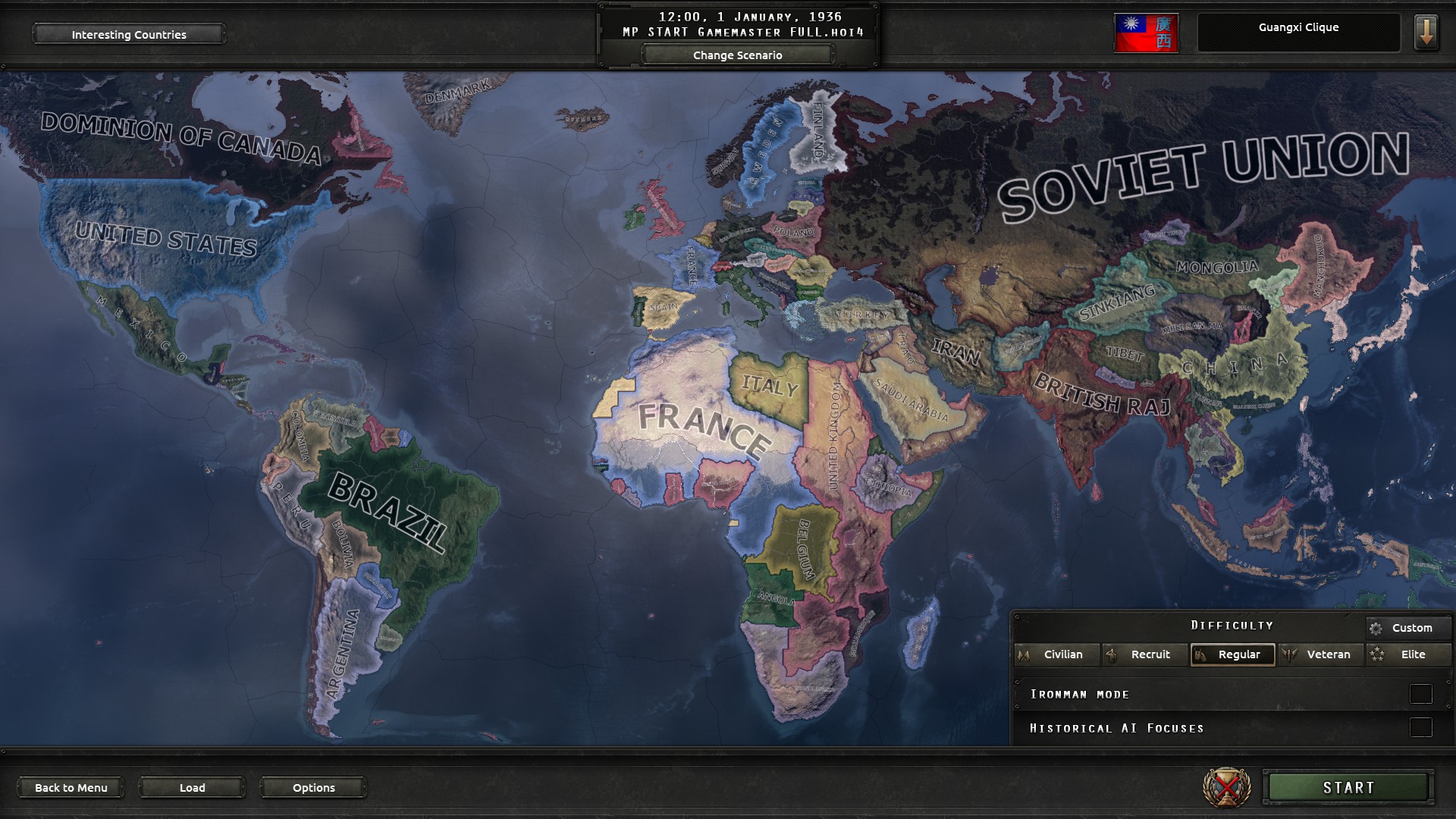 Spielgeschwindigkeit bis Kriegsbeginn ist 3. Sollten Länder die in der Zeit im Krieg sind, Schwierigkeiten haben, wird auf 2 gestellt. z.b. Spanischer Bürgerkrieg