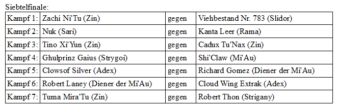 Kampf 1: Im ersten Kampf des Viertelfinales treffen Cadux Tu'Nax auf Robert Thon. Nun steht ein zweihändiges Dusoma gegen ein kleines Kettenmesser. Robert Thon hat sich scheinbar an den Kampfstil der Zin gewöhnt, denn er weicht jedem Schlag von Cadux aus. Der Kampf dauert einige Zeit doch dann bricht das Dusoma durch. Das Kettenmesser scheint die Klinge bei jeder Berührung geschwächt zu haben. Ohne Waffe konnte Cadux nicht mehr bestehen.