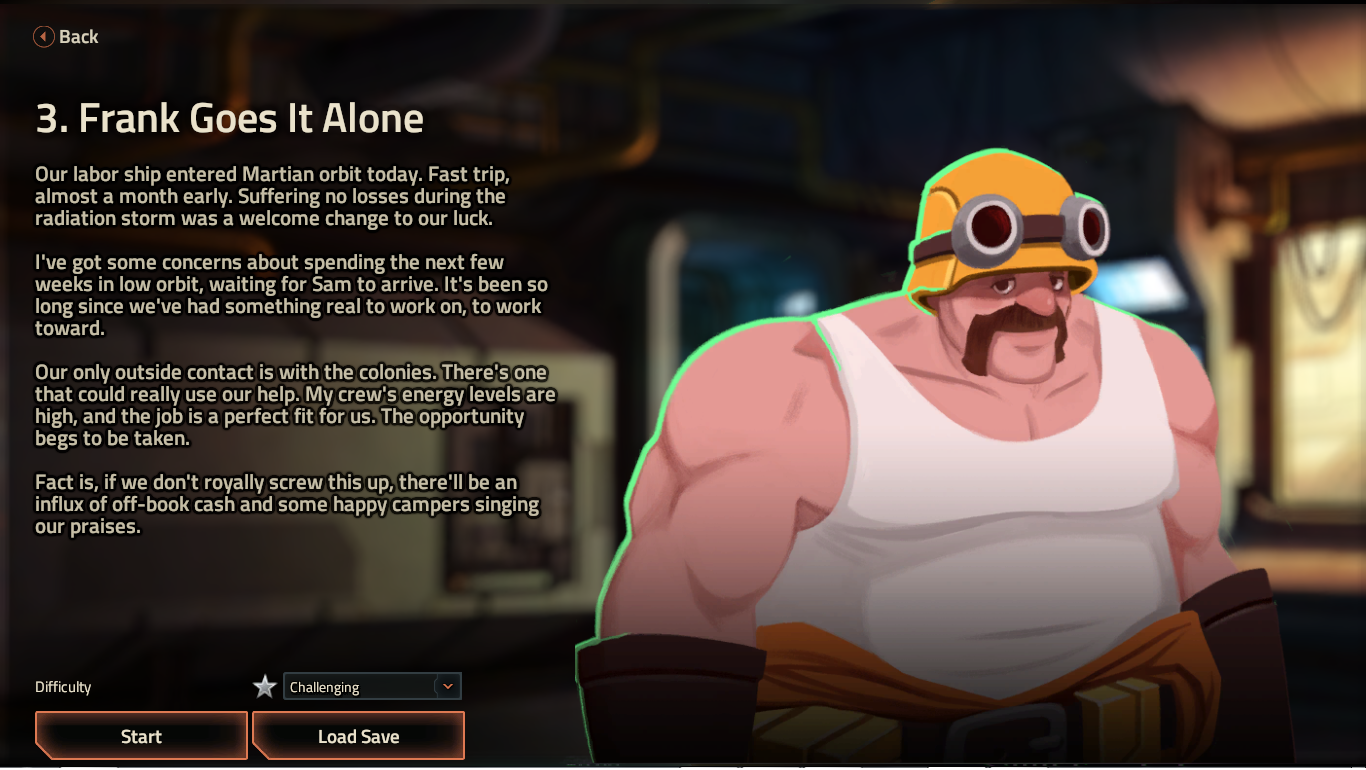 Das erste Szenario habe ich auf mittleren Schwierigkeitsgrad ohne Mühen im ersten Anlauf geschafft, aber ich war dabei auch nicht sonderlich sparsam. Das zweite Szenario hat im Vertrag außerdem ein Zeitlimit, und natürlich hab ich das erstmal nicht geschafft. Im zweiten Anlauf hatte ich dann aber noch 1 1/2 Tage Zeit über, da hatte ich mich wohl im ersten Anlauf zu wenig angestrengt...
