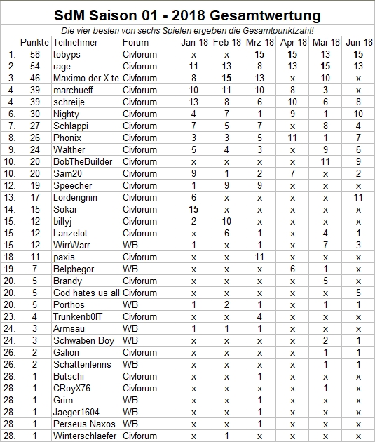 17 Teilnehmer kämpften zum Abschluss der ersten Saison 2018 um den Sieg. Am schnellsten schaffte die Aufgabe tobyps aus dem Civforum, herzlichen Glückwunsch! :ymapplause:
