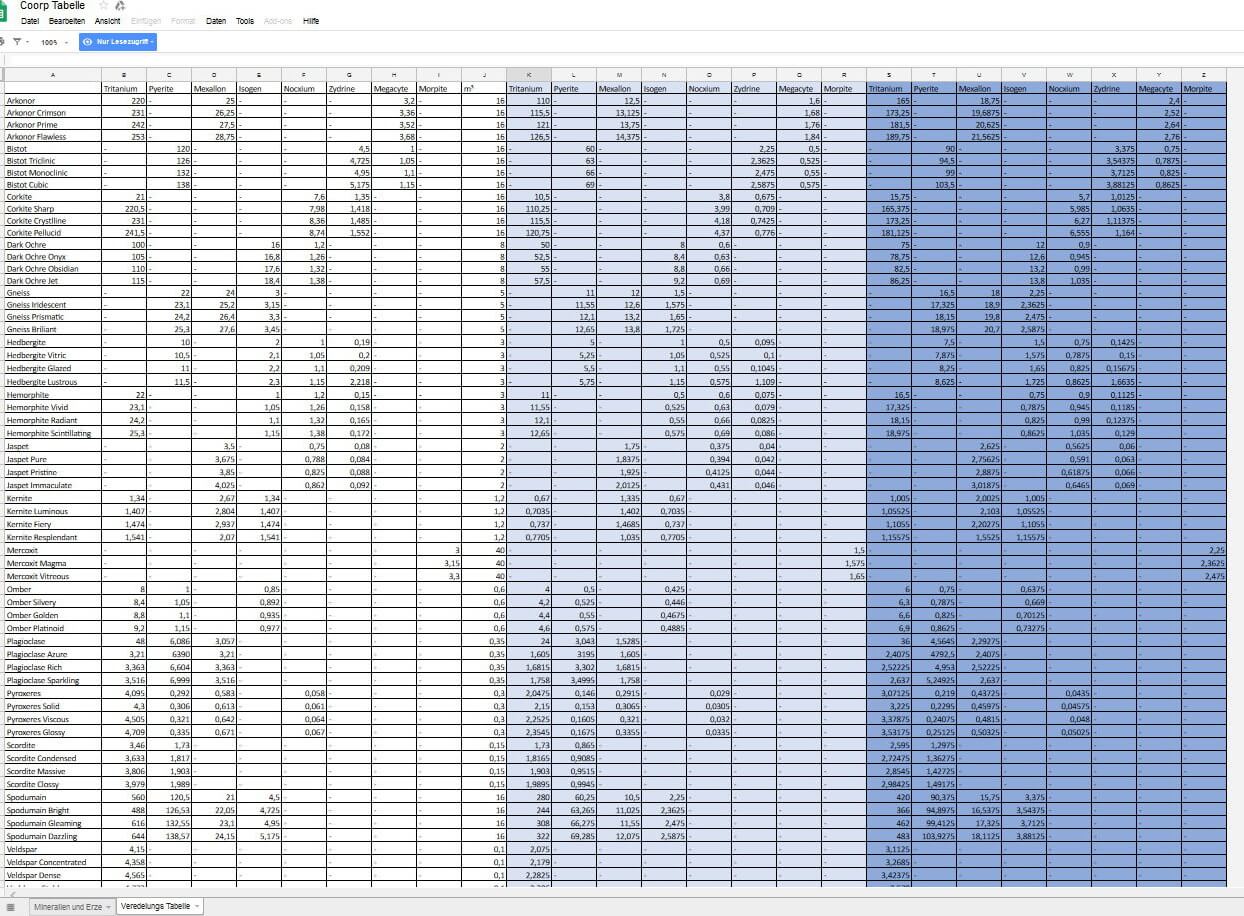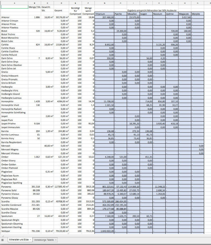 Außerdem haben wir gleich übersichtlich eine Tabelle mit Aufbereitungsergebnissen der Erze in Mineralien bei entsprechender Skillstufe.