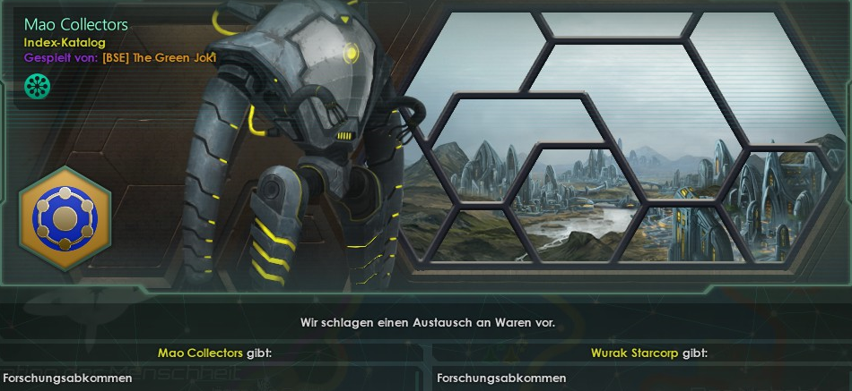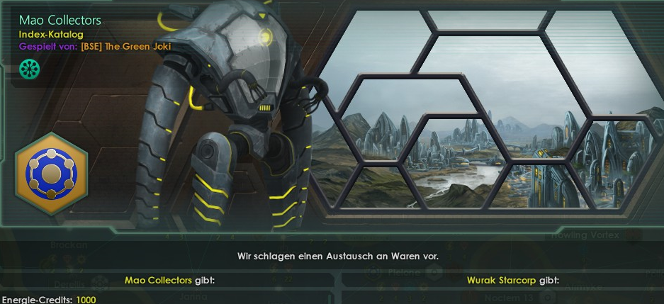 "Auch mit den MAO Collectors kam es zu weiteren Handelsaktivitäten. Wir erhalten von ihnen Forschungsdaten und Lythurgas und zahlen ihnen monatlich 28 Energie für die Dauer der Lythurgas Lieferungen. Weiterhin konnte die Kooperation zwischen den MAO Collectors und Exo Dynamics weiter ausgebaut werden. Das vorgegebene Ziel von Exo Dynamics ist, eines Tages den Geist in einen synthetischen Körper zu transferieren und dadurch ein ewiges Leben zu ermöglichen. Ob dies klappt ist aber noch abzuwarten. Vorerst müssen wir uns mit den kybernetischen Verbesserungen, die das Leben leichter machen, begnügen."