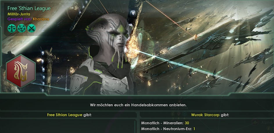 "Weiterhin ist es uns gelungen ein neues System für uns zu sichern. Augenscheinlich verläuft der Krieg der Jäger von Cygoli gegen die Sthian League alles andere als erfolgreich. Wir liefern Ihnen Mineralien und Neutronium-Erz, um den Krieg zu ihrem Gunsten zu verschieben, und erhalten im Gegenzug das Epsilon Indi - System und Zugang zu ihren Forschungsdaten. -Wir können nur hoffen, dass die Verzweiflung bei den Jägern zunimmt. Weitere Verträge werden deutlich teurer."