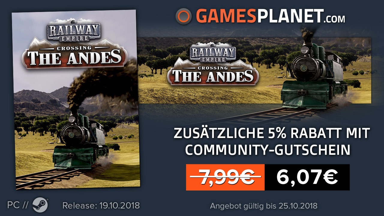Der neue DLC bringt u.a. 3 neue Kartenszenarien zum Bau der ersten Eisenbahnlinien in und über die Anden. Zudem erweitert er das Sandbox- und das Freie Spiel um Südamerika. Es wird zehn neue Waren geben (Lamas!), 34 neue Städte und zwei neue Lokomotiven.
