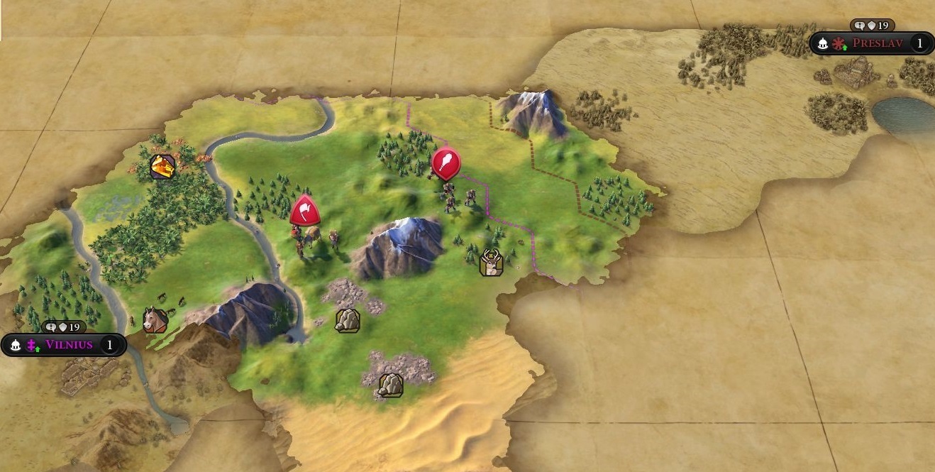 - Ihr spielt allein mit einigen Stadtstaaten. Die andere Zivilisation im Spiel existiert nur auf dem Papier, bemüht euch nicht, sie zu finden. Barbaren gibt es aber trotzdem, ganz ohne Militär geht es also vermutlich nicht. Was ihr mit den anderen Stadtstaaten außer Vilnius/Preslaw macht, ist euch überlassen.