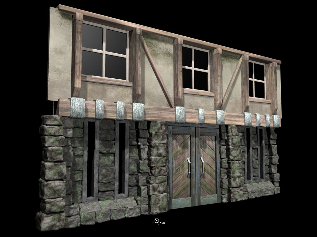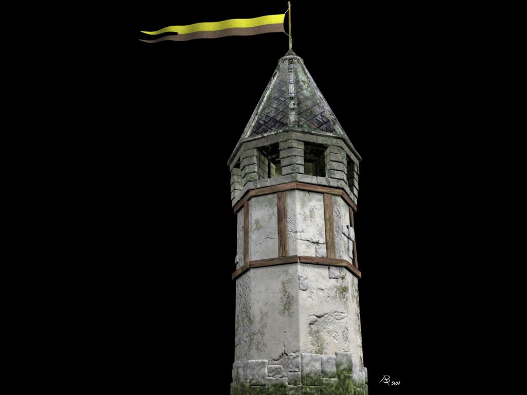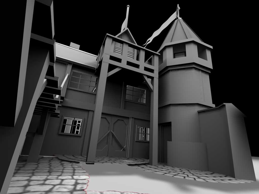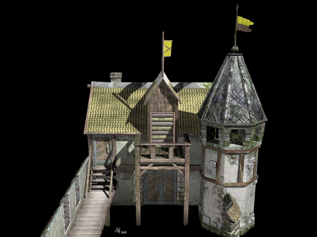 Was Du wohl als Eigenschattierung der Steinen interpretierst, ist lediglich die Farbgebung der Steintextur(en). Auf der nachfolgenden farbigen Version dieses Renderings kann man das besser sehen. Fotorealistisch sollte der 2007 entstandenen Gebäudekomplex (ein Wachhaus aus Anno 1701) übrigens nie werden. Das Rendering ist während der Kontruktionsphase des Gebäudes entstanden. Der Vollständigkeit halber füge ich hier weitere Renderings dieses Projektes bei. Warum ich die S/W-Abbildung überhaupt hier online gestellt habe, verrate ich am Ende...