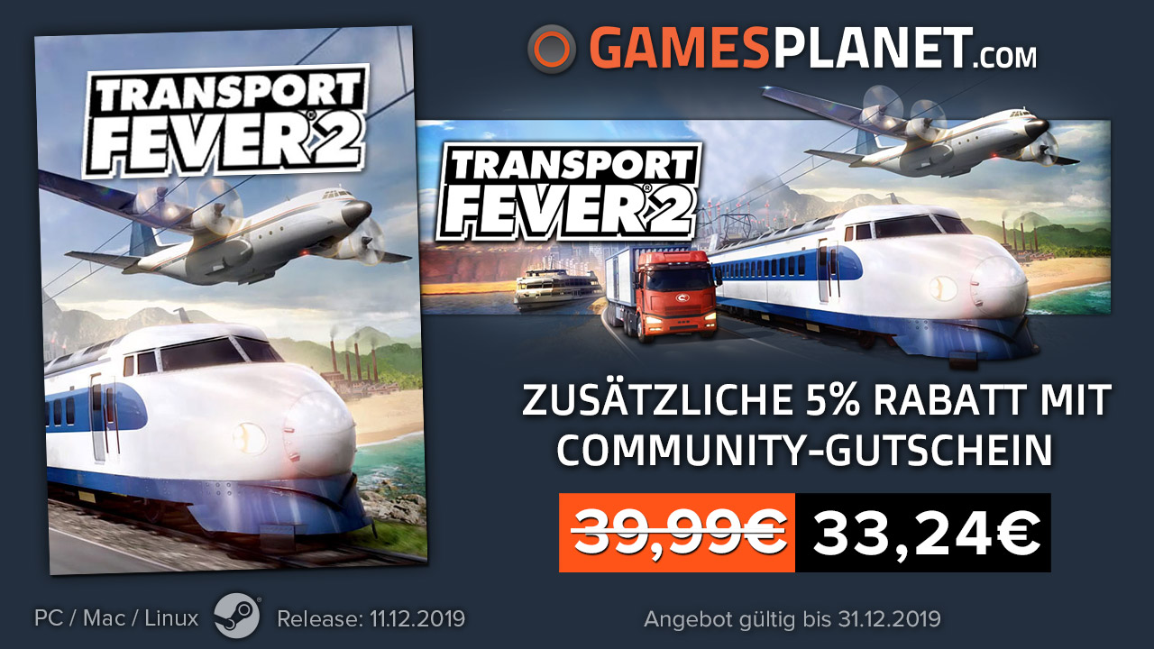 * Wenn ihr den Vorgänger Transport Fever auf Steam aktiviert hat, bekommt ihr den Nachfolger Transport Fever 2 beim Direkt-Kauf auf Steam mit 15% Extra-Rabatt und damit unterm Strich preiswerter als bei Gamesplanet.