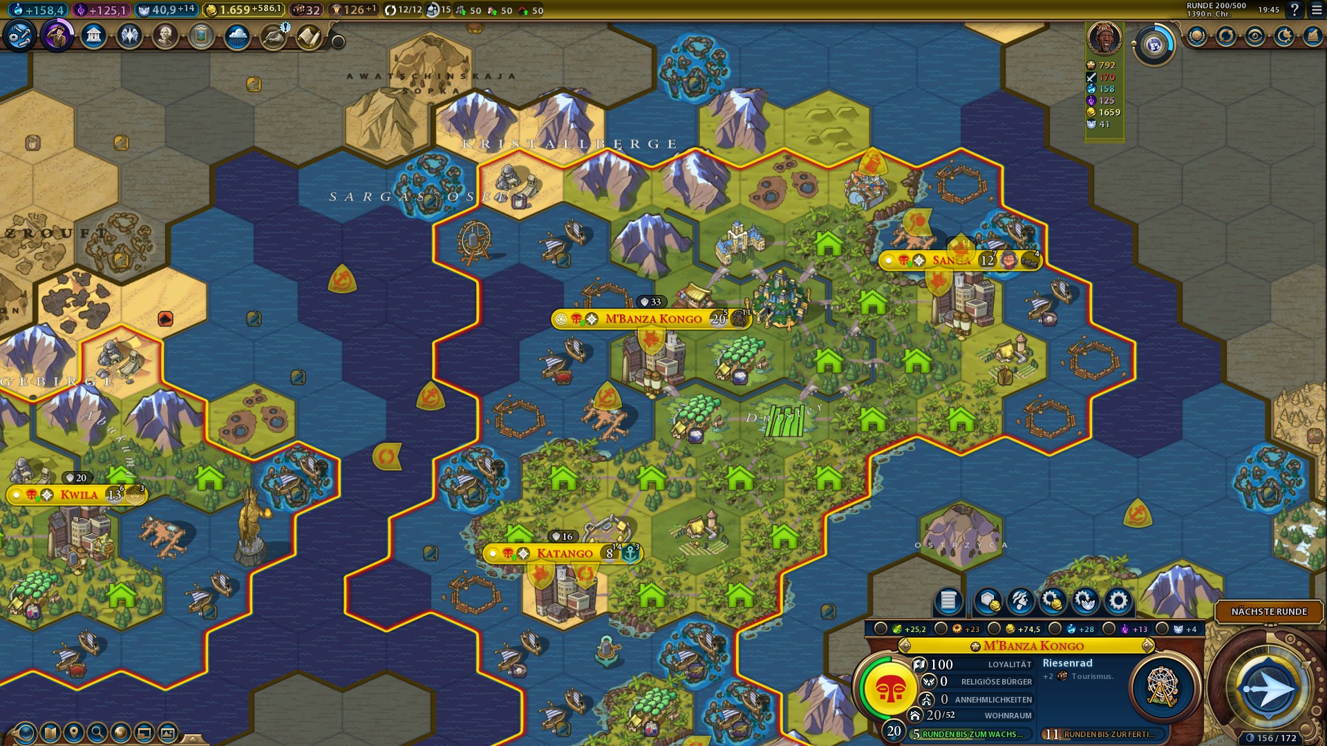 Gegen Ende wußte ich langsam nicht mehr, was ich noch bauen soll, um mehr Nahrung/Bevölkerung zu bekommen. Darum habe ich die Städte weiter mit Mbanzas geplastert, obwohl Wohnraum in Hülle und Fülle da war.
