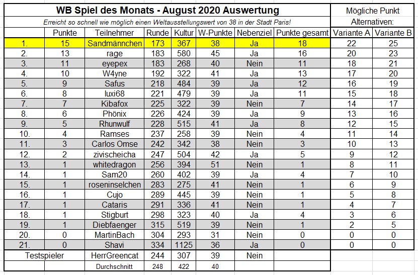 In diesem Monat haben 21 Teilnehmer/innen ihren Spielstand eingeschickt und von einigen Teilnehmern des Vormonates weiß ich, dass bei Ihnen die Zeit für das Spiel des Monats nicht gereicht hat. Außerdem hatten wir ein paar Spieler dabei (sowohl eingeschickt als auch nicht) die das Hauptziel nicht erreichen konnten, da sie beim Setzen des Regierungsbezirkes einen Fehler gemacht hatten und dann auch nicht alle Wunder bauen konnten.