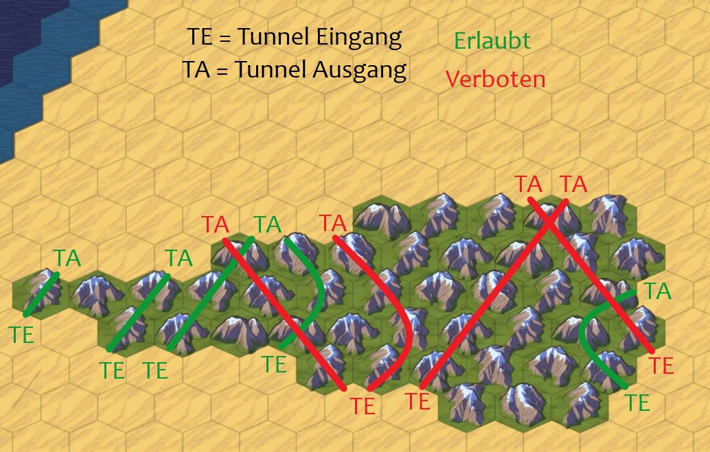 Dabei dürfen maximal 3 Gebirgstunnel von je einer Länge von 3 Berggeländefelder genutzt werden. Das Schienennetz muss ungeplündert sein! Verschiedene Varianten von Gebirgstunneln können im unteren Bild gesehen werden: EINSTELLUNGEN