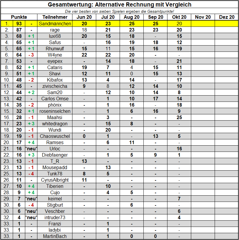 Für die Saisonwertung bekommen die Spieler geordnet nach Geschwindigkeit (Anzahl der benötigten Runden! Nicht Einsendedatum!) 15, 13, 11, 10, 9, 8, 7, 6, 5, 4, 3, 2, 1 Punkte. Jeder Spieler, der das Hauptziel erreicht, erhält mindestens einen Punkt.
