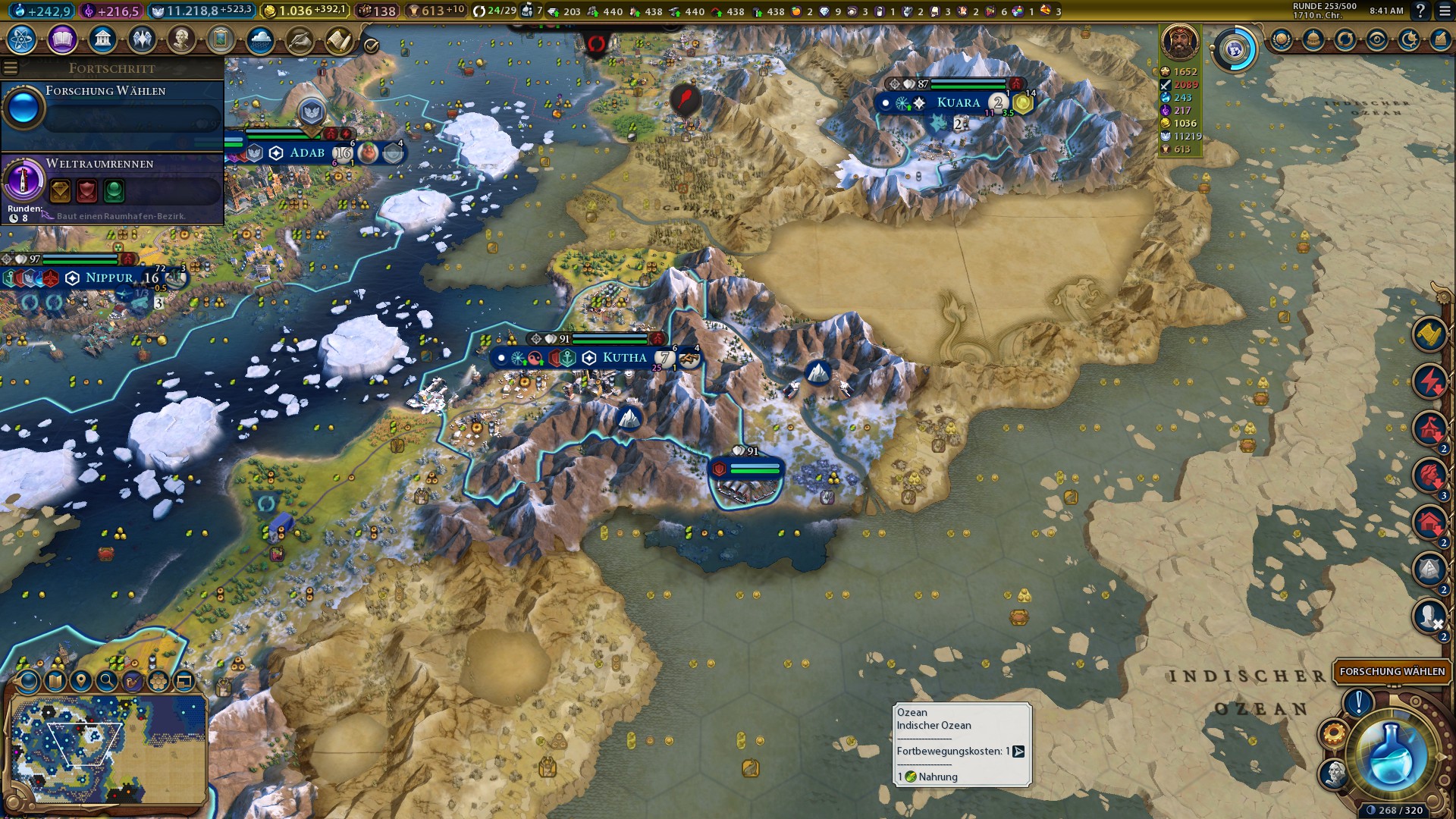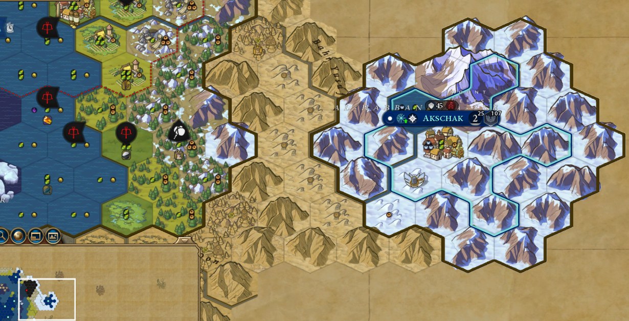 Ich habe ueber den Kulturstadtstaat usw dann Zugriff auf Kabuls Einheiten gehabt und die zweite See erkundet, bis ich endlich eine Gebirgsenge entdeckte, ueber die ich Lager bauen konnte: