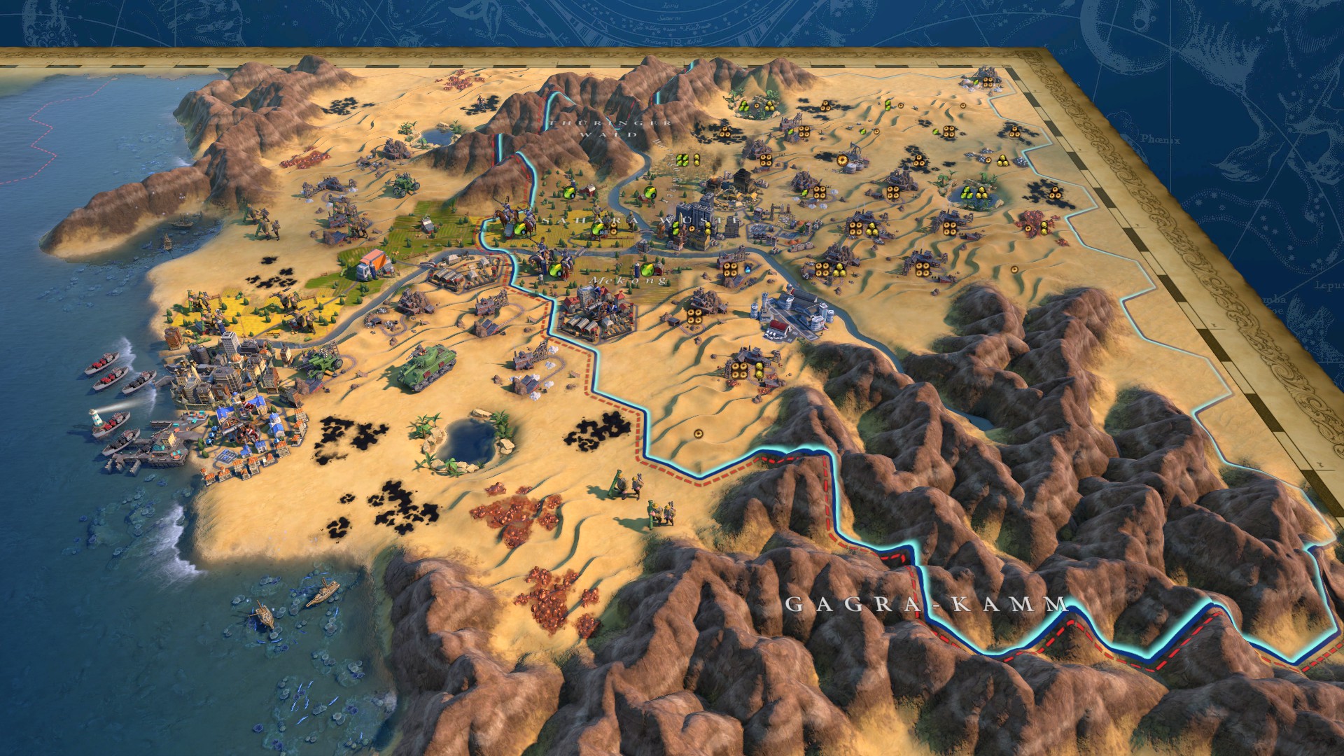 Ein Bergmassiv über die ganze Karte von Oben nach unten – nur an einer Stelle weniger als 3 Felder dick und einem Durchgang bei Akkad, der nicht „friedlich“ genutzt werden konnte.
