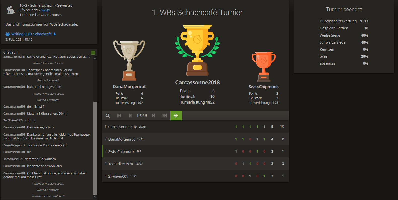Wir planen ein weiteres Turnier nächste Woche Dienstag, 09.02.21 ab 20 Uhr. Damit waren alle Teilnehmer des letzten Turniers einverstanden. Es werden wieder 5 Runden im schweizer System gespielt und wir haben vorgestern dafür nicht ganz 2 Stunden gebraucht. Hier könnt ihr euch Anmelden, wenn ihr Lust habt.FreierWind hat geschrieben: ↑4. Februar 2021, 11:55 Ich wäre nächstes Mal gerne dabei.