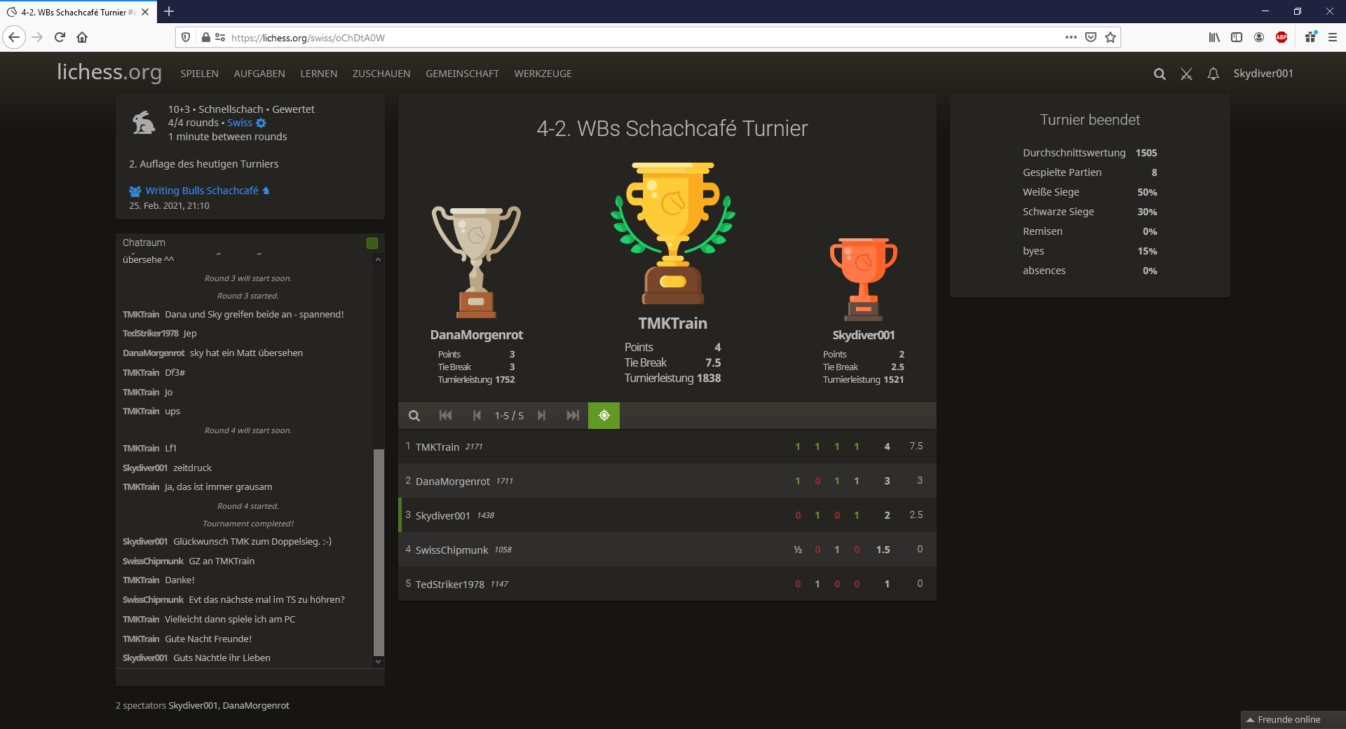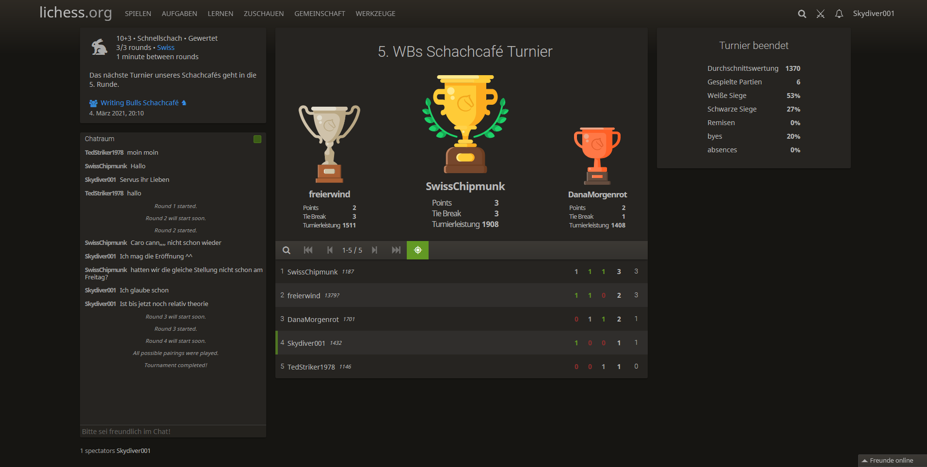 Herzlichen Glückwunsch an Chipmunk und Freierwind für den jeweiligen Turniersieg und vielen Dank an euch alle für die schönen Partien und das nette beisammensein.