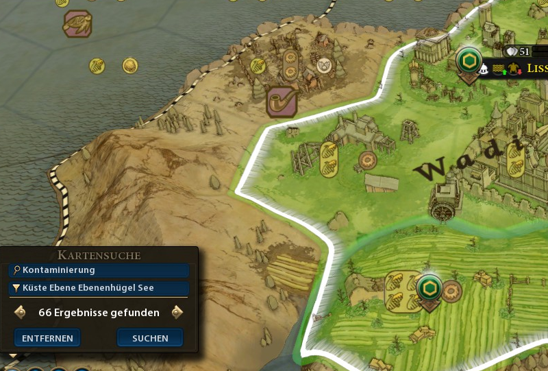 Wenn ihr die Begriffe "Kontaminierung" im Suchfeld und die Begriffe "Ebene Ebenenhügel Küste See" im Filter eingebt, dann werden nur die kontaminierten Grasland Geländefelder angezeigt (sofern ihr nicht in der Wüste oder Tundra herum ballert). Lediglich wenn auf einem Grasland ein Seebad errichtet wurde, funktioniert das Anzeigen der entsprechenden Geländefelder nicht korrekt. Aber das prüfe ich natürlich auch nach.