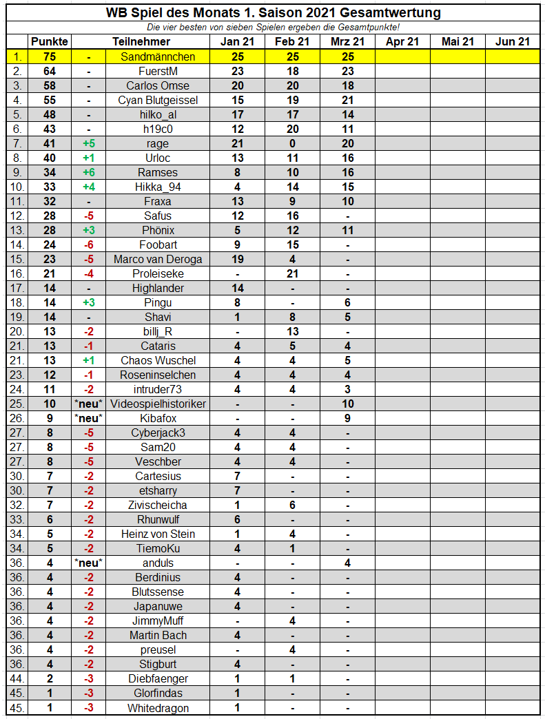 Mit dem dritten Spiel der Saison werden die Platzierungen so langsam konkreter und die einmaligen Teilnehmer rutschen immer weiter in die untere Tabellenhälfte. Sandmännchen ist weiterhin perfekt in dieser Saison und dadurch wird es wahrscheinlich nur noch einen heißen Kampf um die beiden anderen Treppchenplätze geben. Ich drücke allen die Daumen für erfolgreiche weitere Spiel des Monats Herausforderungen.
