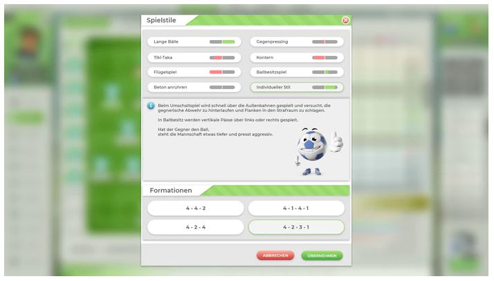 Im Spieltagskader wird die Aufstellung für das nächste Spiel bestimmt. Als Basis können moderne Spielstile und Formationen übernommen oder komplett eigene Spielsysteme erstellt werden.