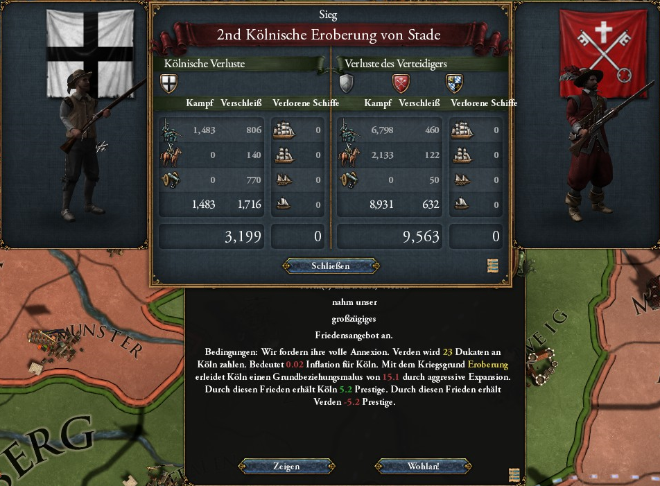 Mitte 1607 schlugen erneut die Trommeln des Krieges in Köln. Wir erklärten Lüneburg den Krieg um die Provinz Lüneburg, die wir als Kernprovinz ansehen, ins Erzbistum zurück zu holen. Zwei Jahre dauerte der Konflikt gegen Lüneburg und ihre Verbündeten aus Memmingen. Doch schließlich wurden sie besiegt und unser Anspruch konnte durchgesetzt werden.